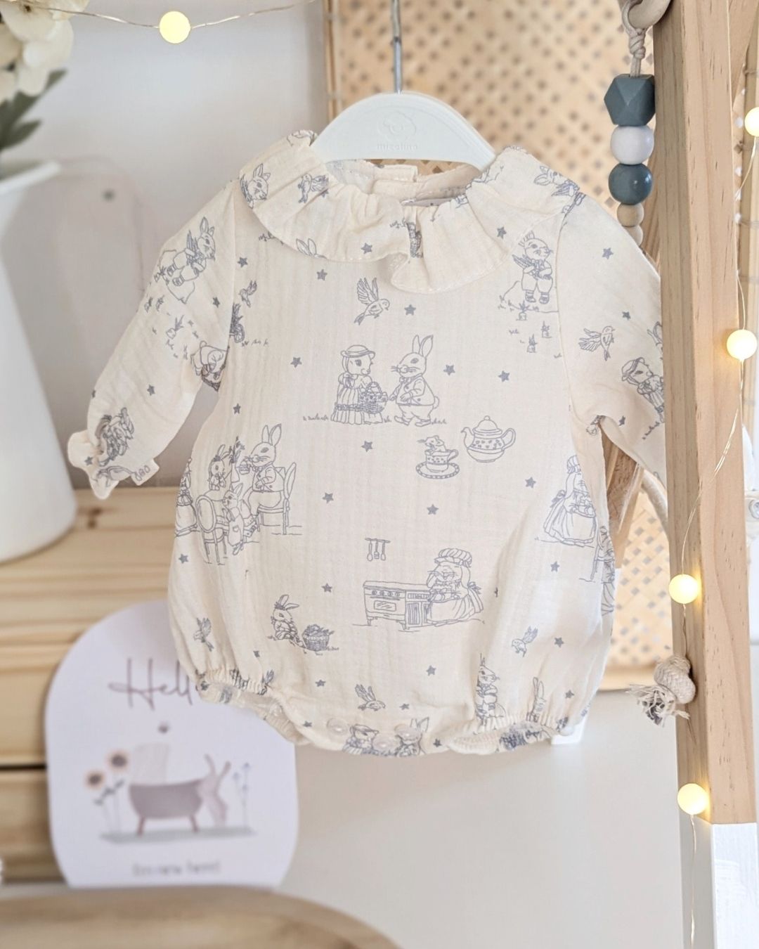 Ranita tipo body en tejido blanco roto con estampado vintage de conejitos. Lleva cuello volante, manga larga con lazo fruncido en los puños y goma en la parte inferior para un ajuste cómodo. Cierre trasero y entrepierna con corchetes para facilitar el cambio.