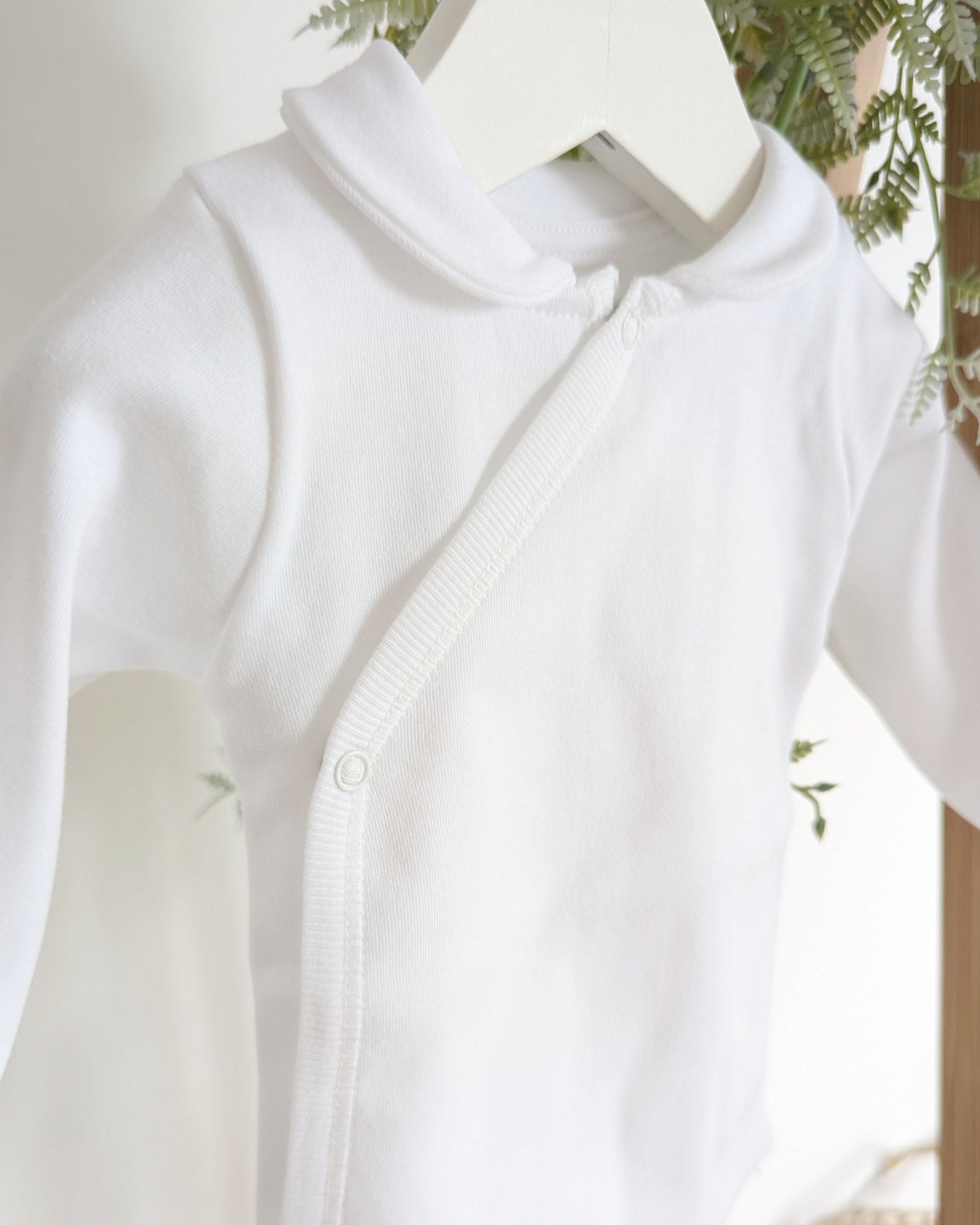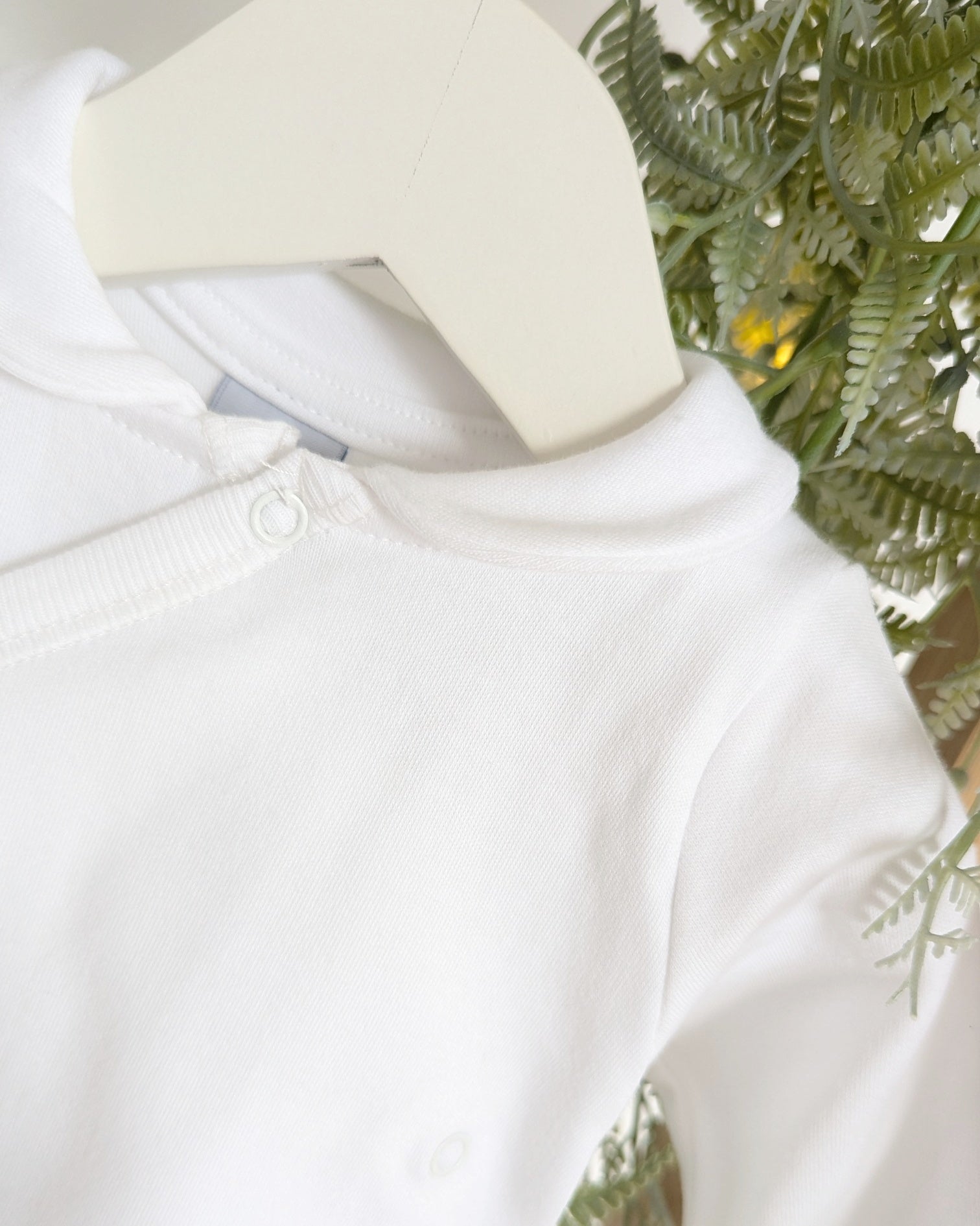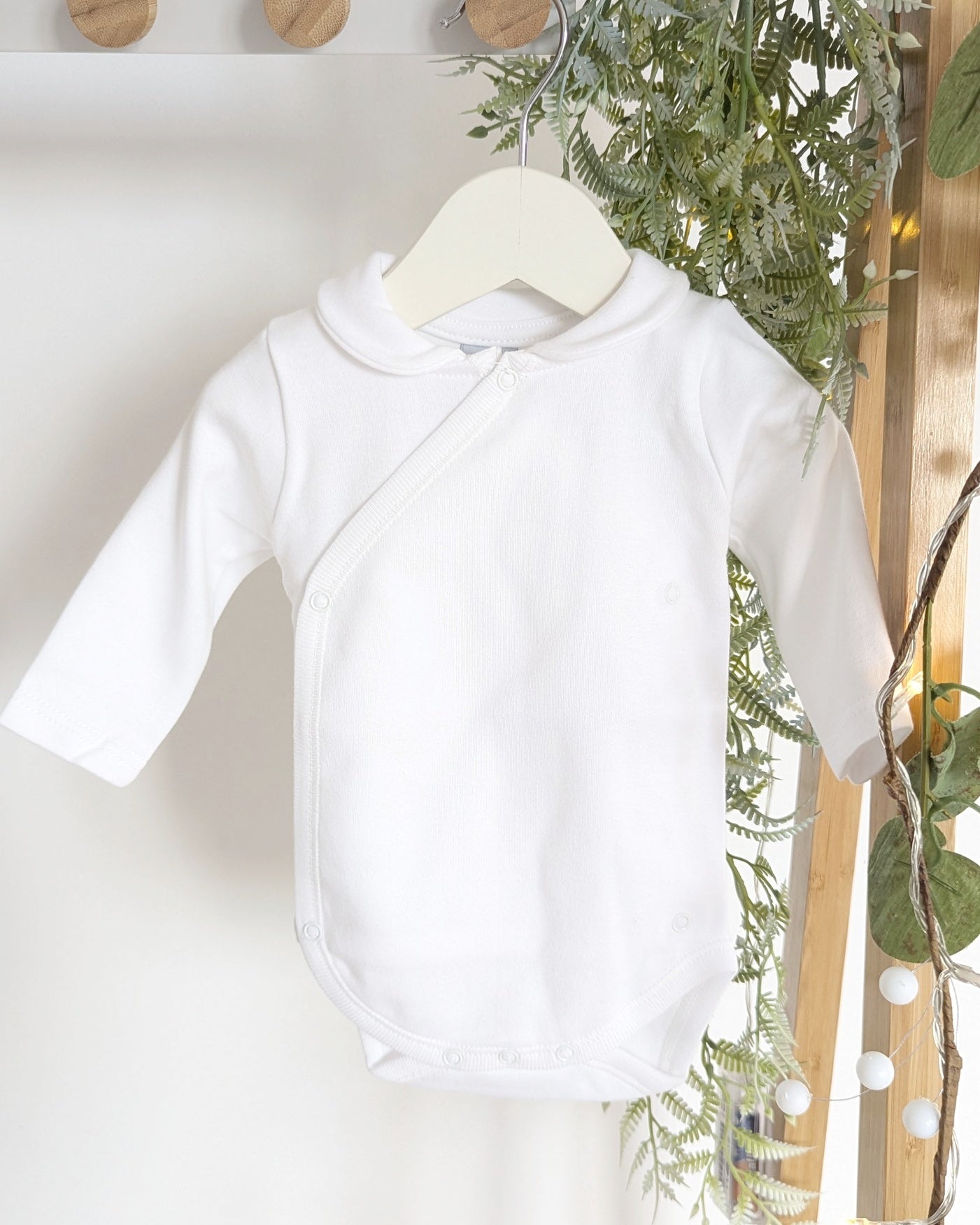 Precioso body con cuello bebé color blanco con abertura delantera para facilitar los cambios de ropa a tu bebé.