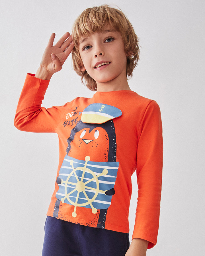Camiseta para bebé niño de 3 meses a 6 años. Lleva el espíritu marinero al atuendo de tu pequeño con esta vibrante camiseta naranja. Decorada con un adorable estampado de pingüino marinero, esta prenda es tanto divertida como cómoda.