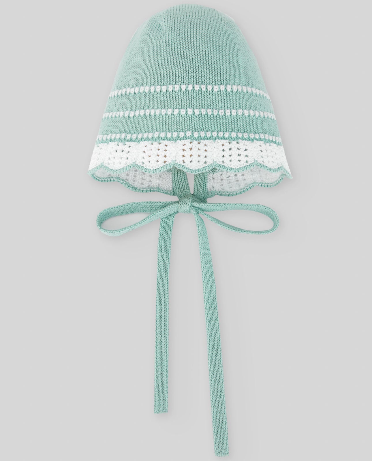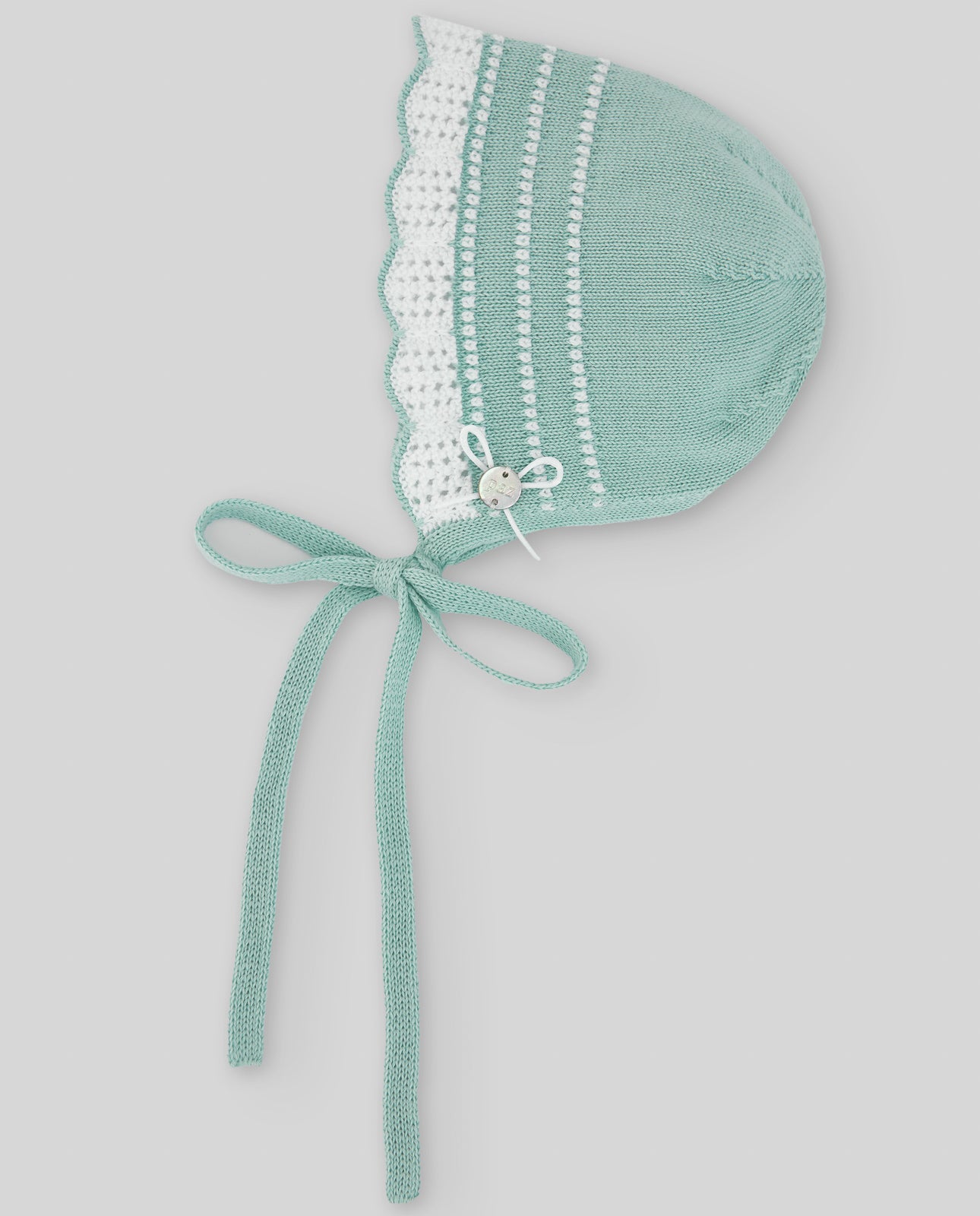 👶 Completa el look de tu bebé con esta delicada capota de punto verde agua de la colección Eido de Paz Rodríguez, perfecta para los días cálidos de primavera y verano. Confeccionada en suave punto 100% algodón, esta capota destaca por su diseño clásico con detalles de puntilla blanca, un pequeño lacito decorativo y cierre con lazo para mejor ajuste.