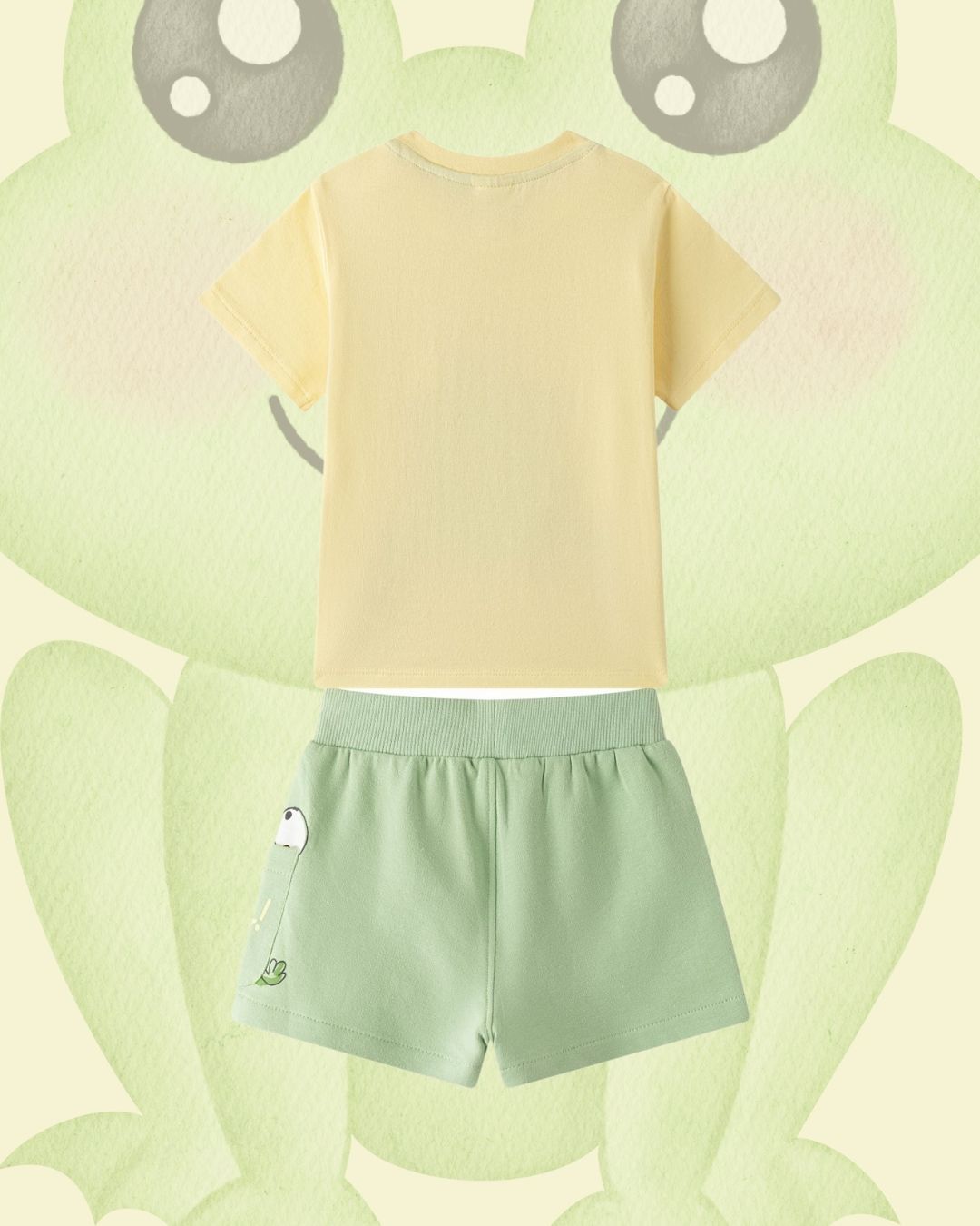 Este original conjunto de algodón para bebé niño incluye camiseta amarilla con rana glotona y short verde con bolsillo decorado. Ideal como ropa barata, cómoda y fresca para el verano. ¡Perfecto para que tu peque explore, juegue y se vea adorable! 👶🏼🩵