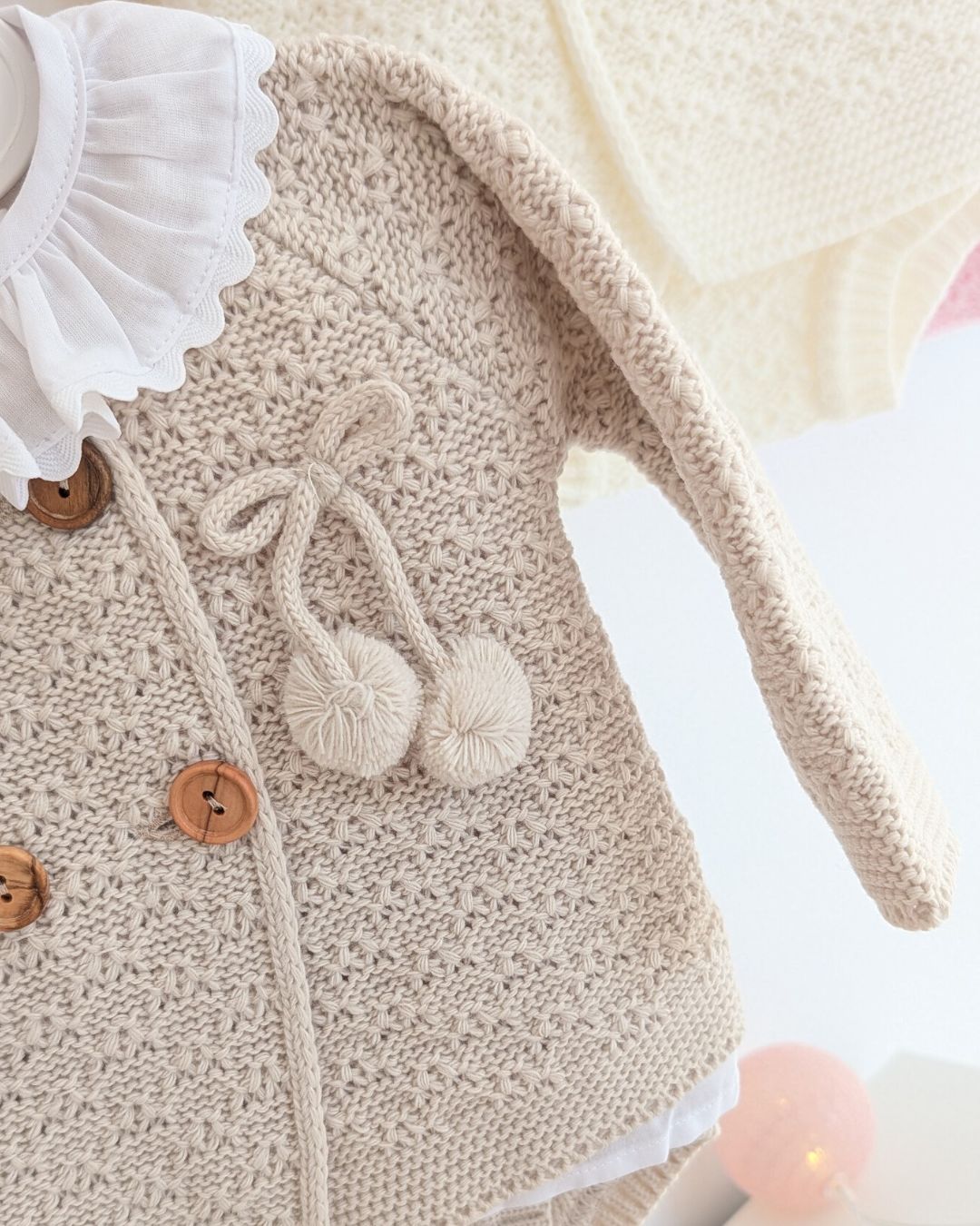 - El conjunto incluye rebeca, blusa, braguita y capota.
