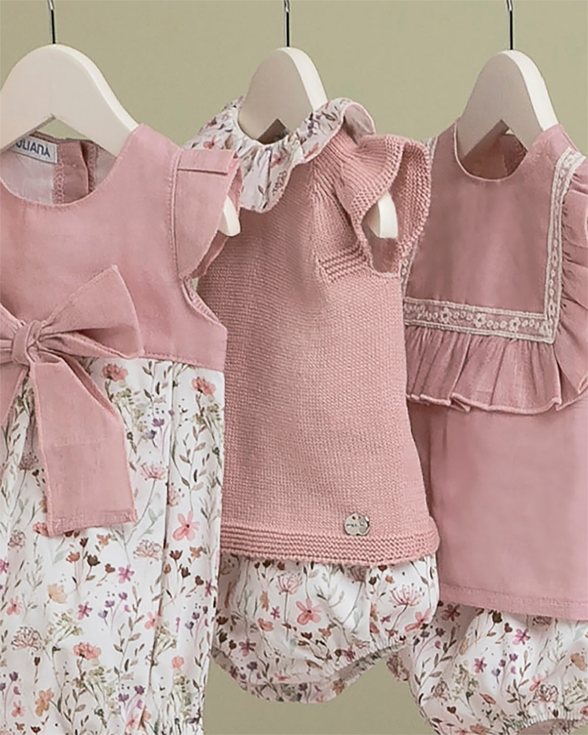 conjunto bebé Juliana, ropa de bebé hecha en España, conjunto floral recién nacido, conjunto primera puesta verano, ropa canastilla Juliana.