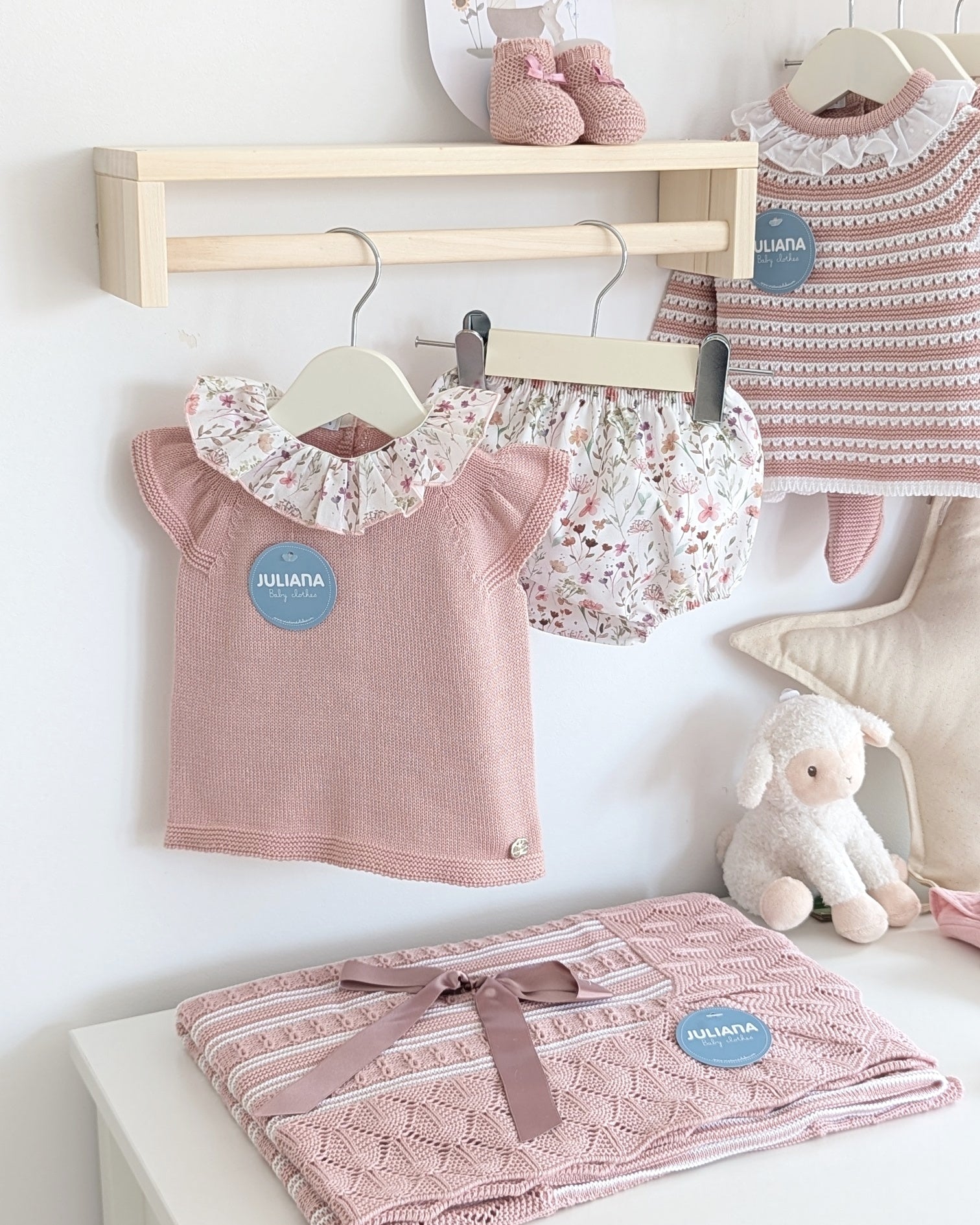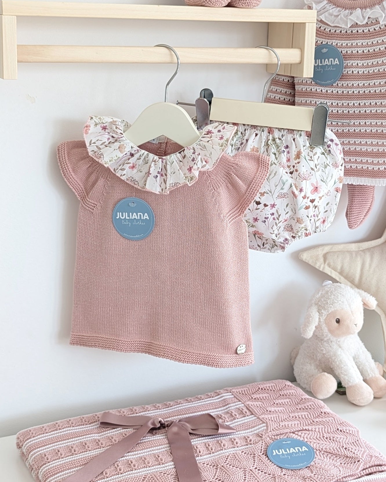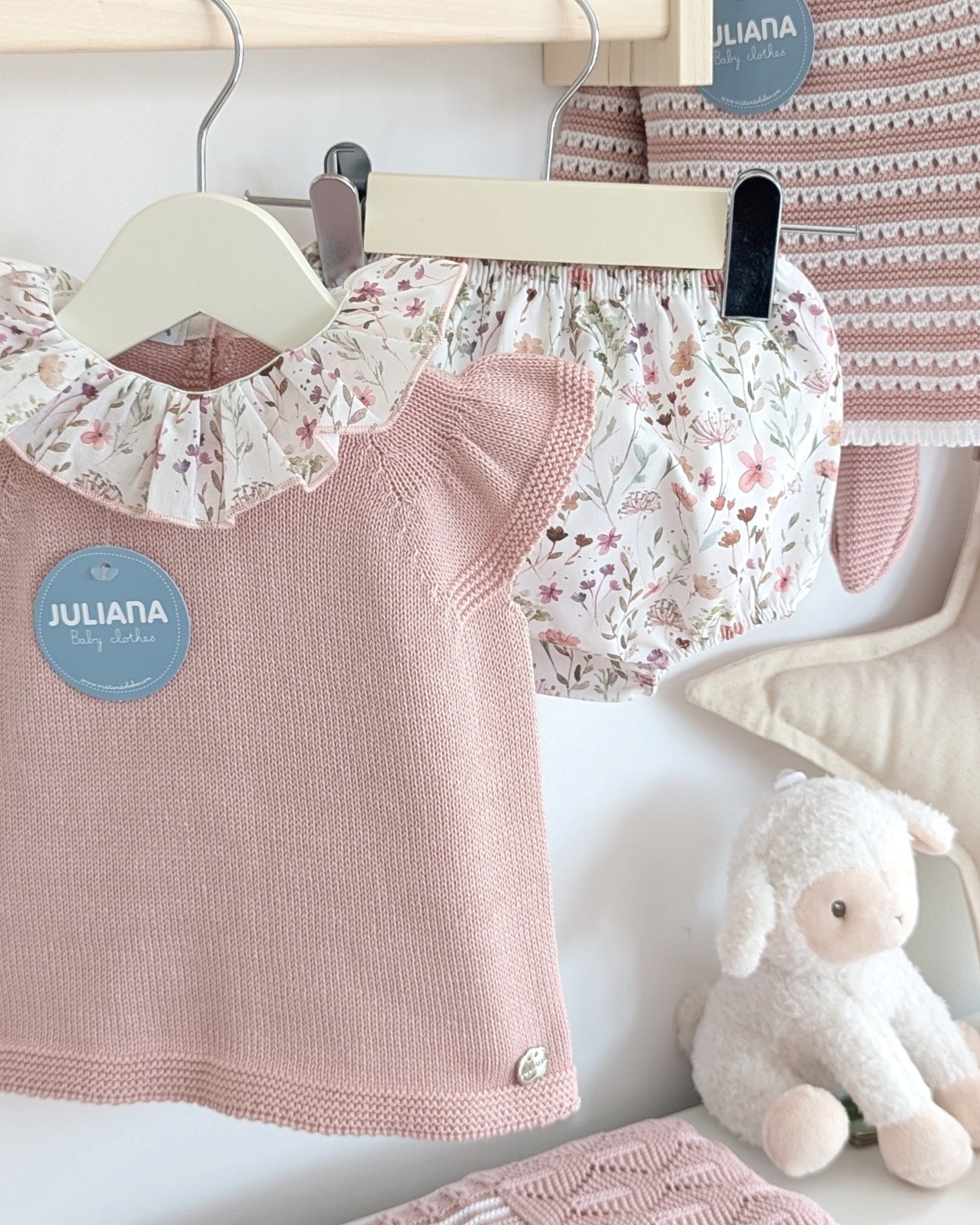 Un conjunto de bebé encantador y delicado, ideal para los días soleados de primavera y verano. Este conjunto de bebé Juliana está compuesto por una camiseta de punto en color maquillaje con volante floral en el cuello y una braguita a juego con estampado de florecitas. ¡Una combinación perfecta de dulzura y estilo! 💕🌼