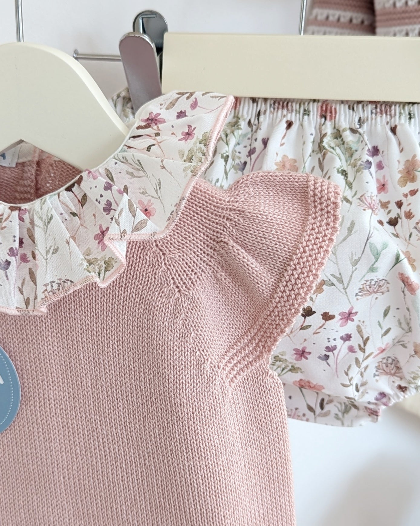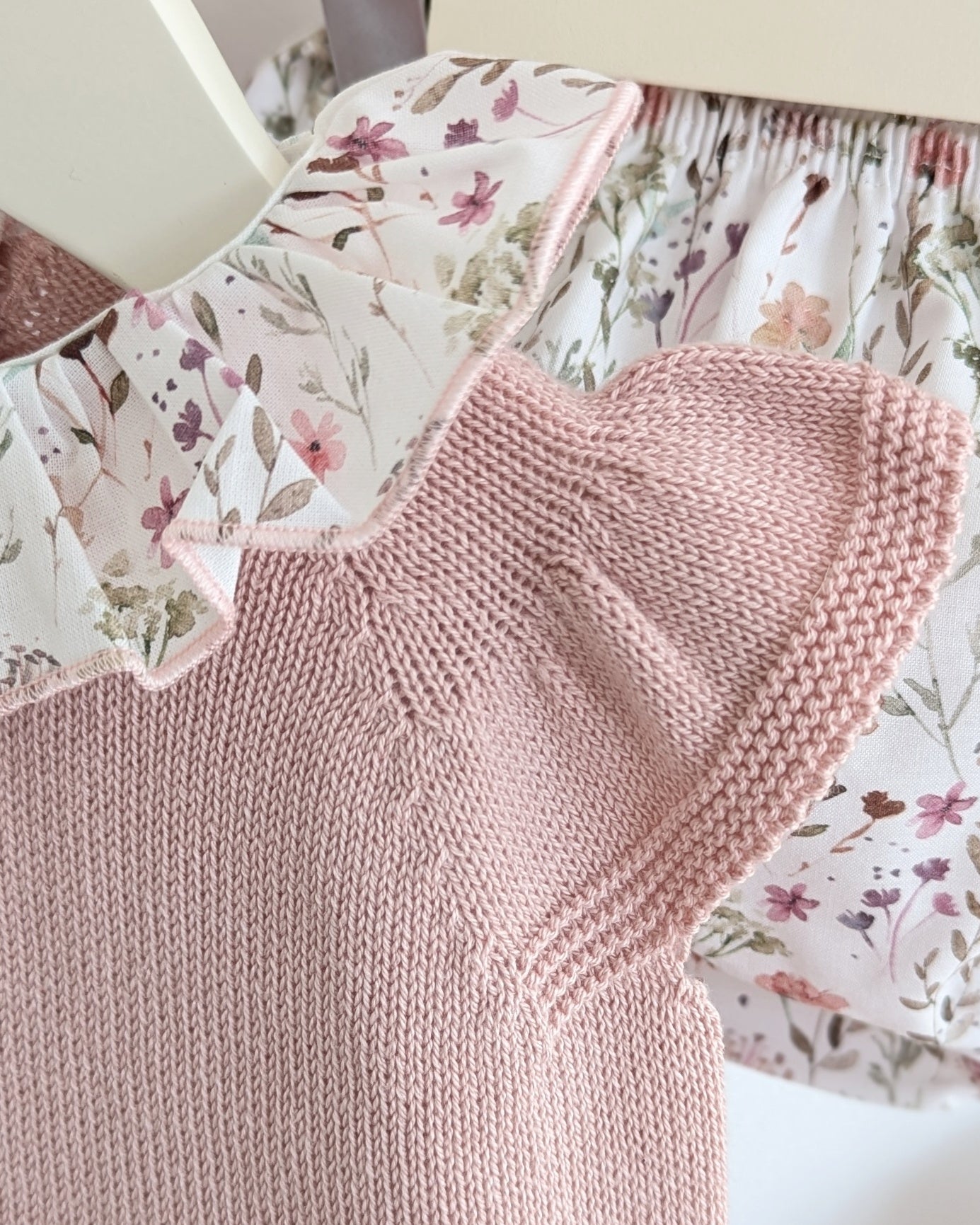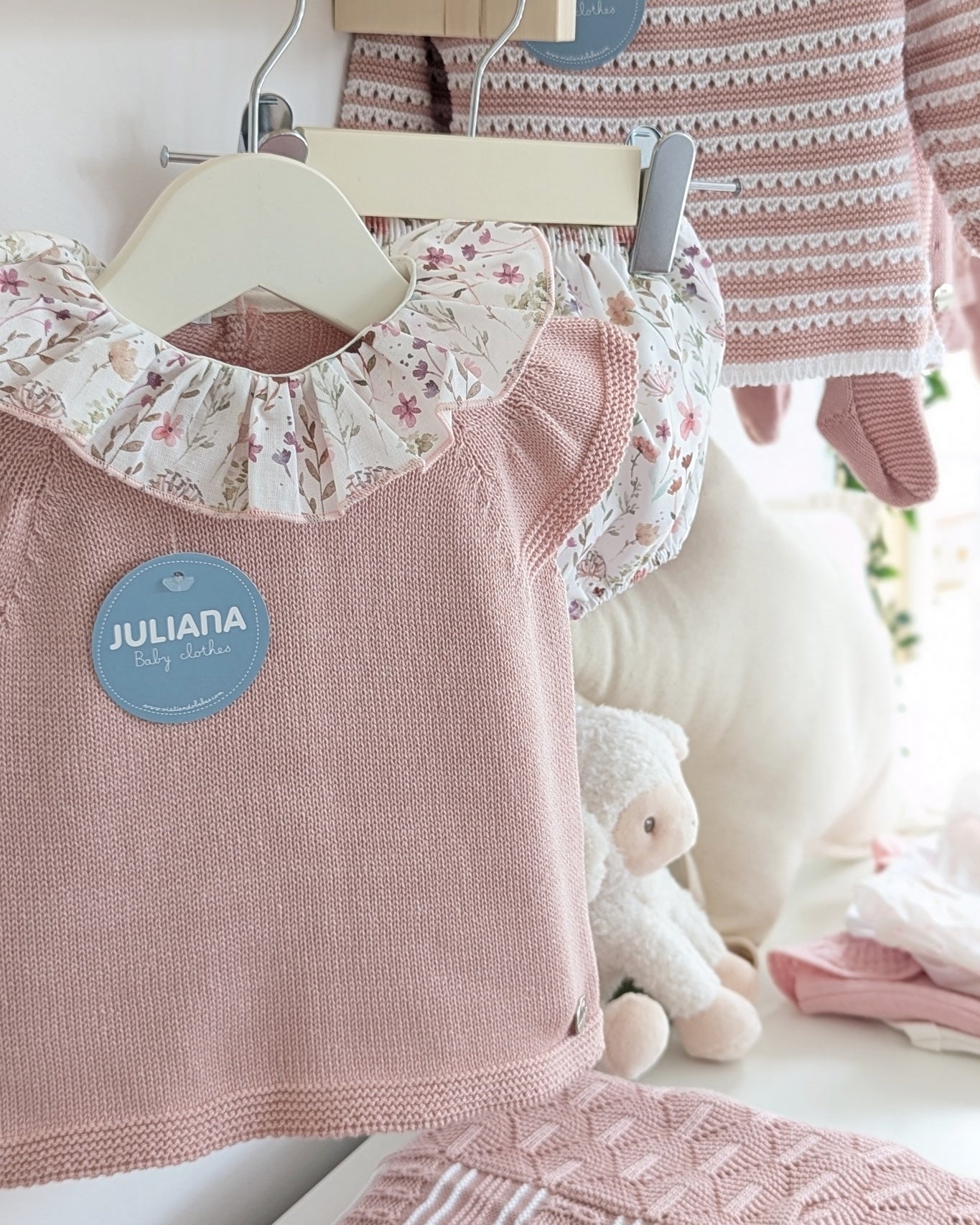 Un conjunto de bebé encantador y delicado, ideal para los días soleados de primavera y verano. Este conjunto de bebé Juliana está compuesto por una camiseta de punto en color maquillaje con volante floral en el cuello y una braguita a juego con estampado de florecitas. ¡Una combinación perfecta de dulzura y estilo! 💕🌼