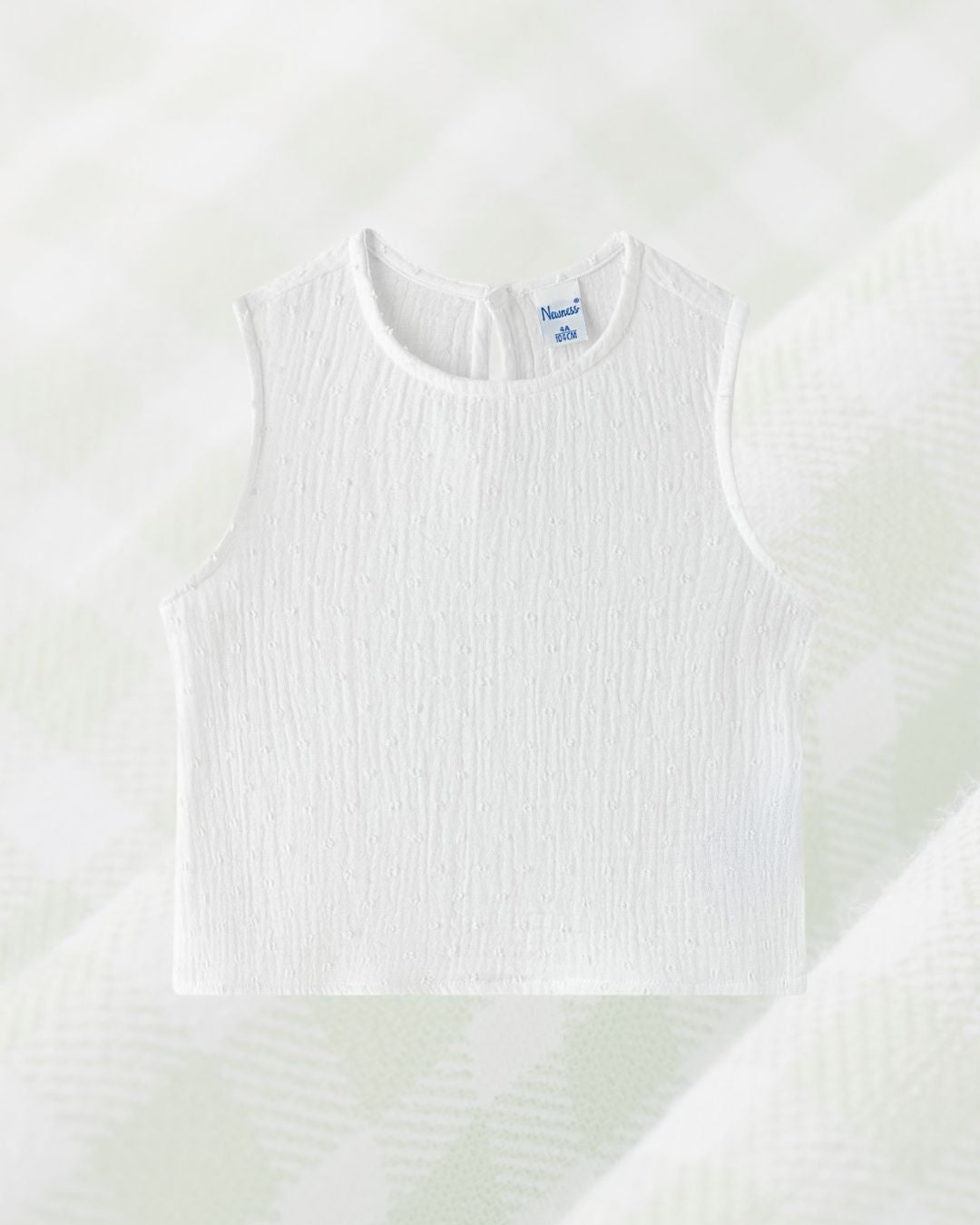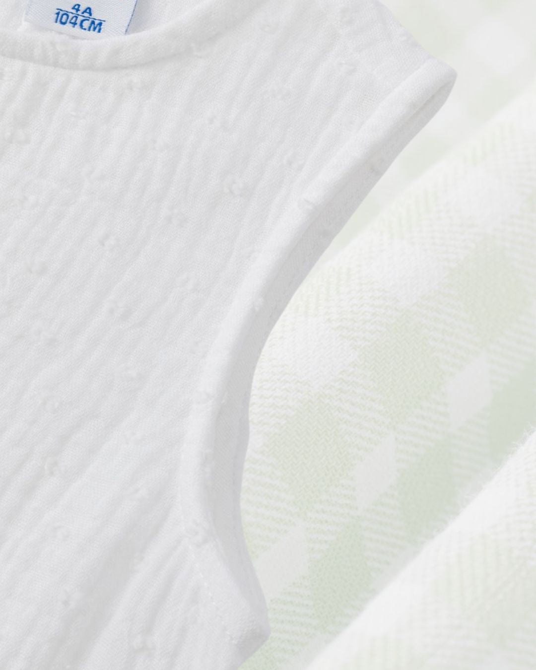 Este encantador conjunto para niña incluye una blusa blanca sin mangas de textura suave y un pantalón largo de cuadros vichy verde con detalle de volantes en los bajos. Perfecto para los días cálidos de primavera y verano, combina frescura, elegancia y comodidad a partes iguales 🌞