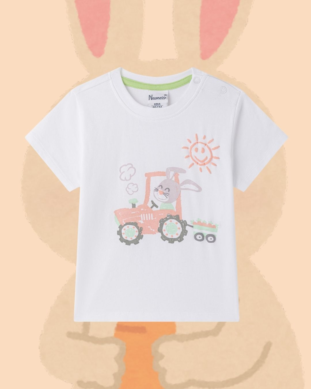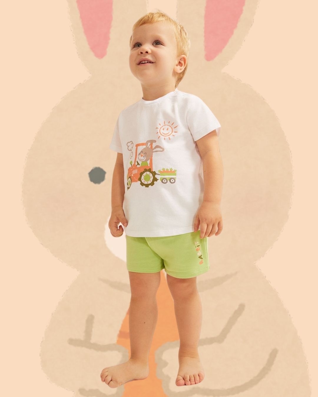 Este tierno conjunto de algodón para bebé niño incluye una camiseta blanca con un divertido conejito en tractor 🐰 y short verde con detalle “Rabbit”. Ideal como ropa cómoda y barata para bebé niño, perfecta para el verano o días de juego al aire libre. 🌱