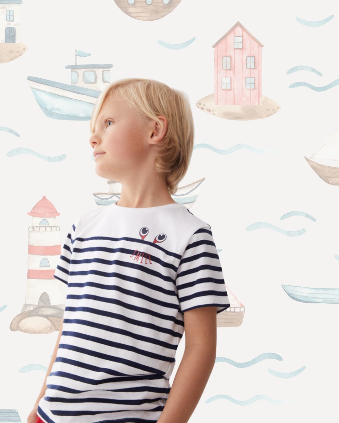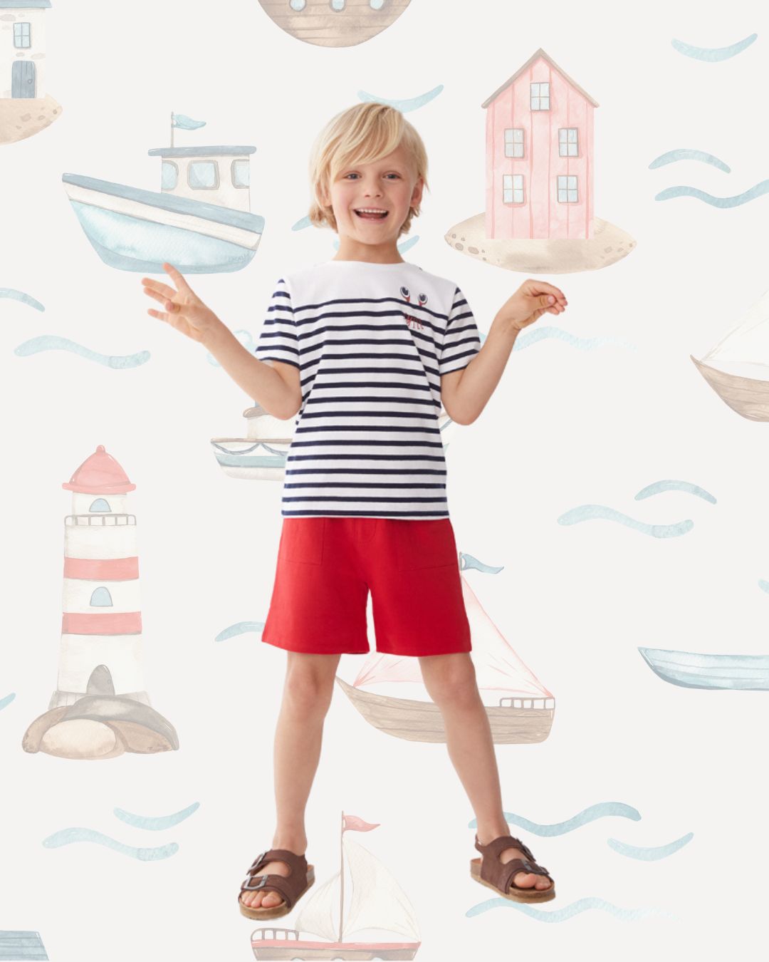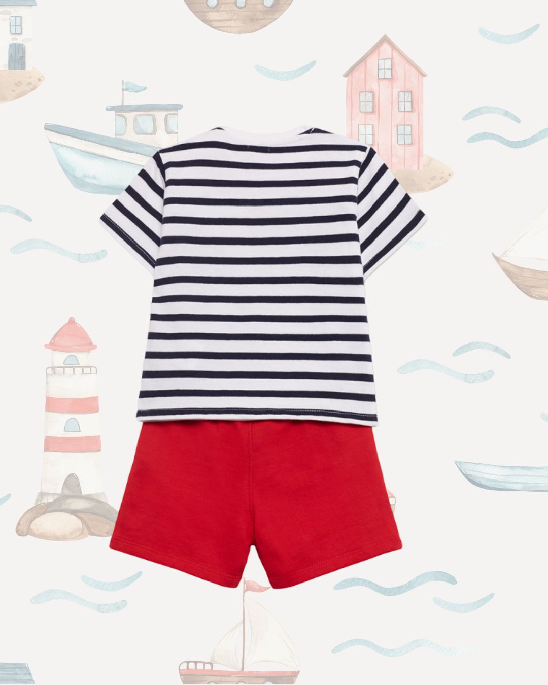 Un clásico que nunca falla 🧽. Camiseta de rayas marineras con divertido cangrejito y short rojo de algodón. Un look fresco y atemporal.