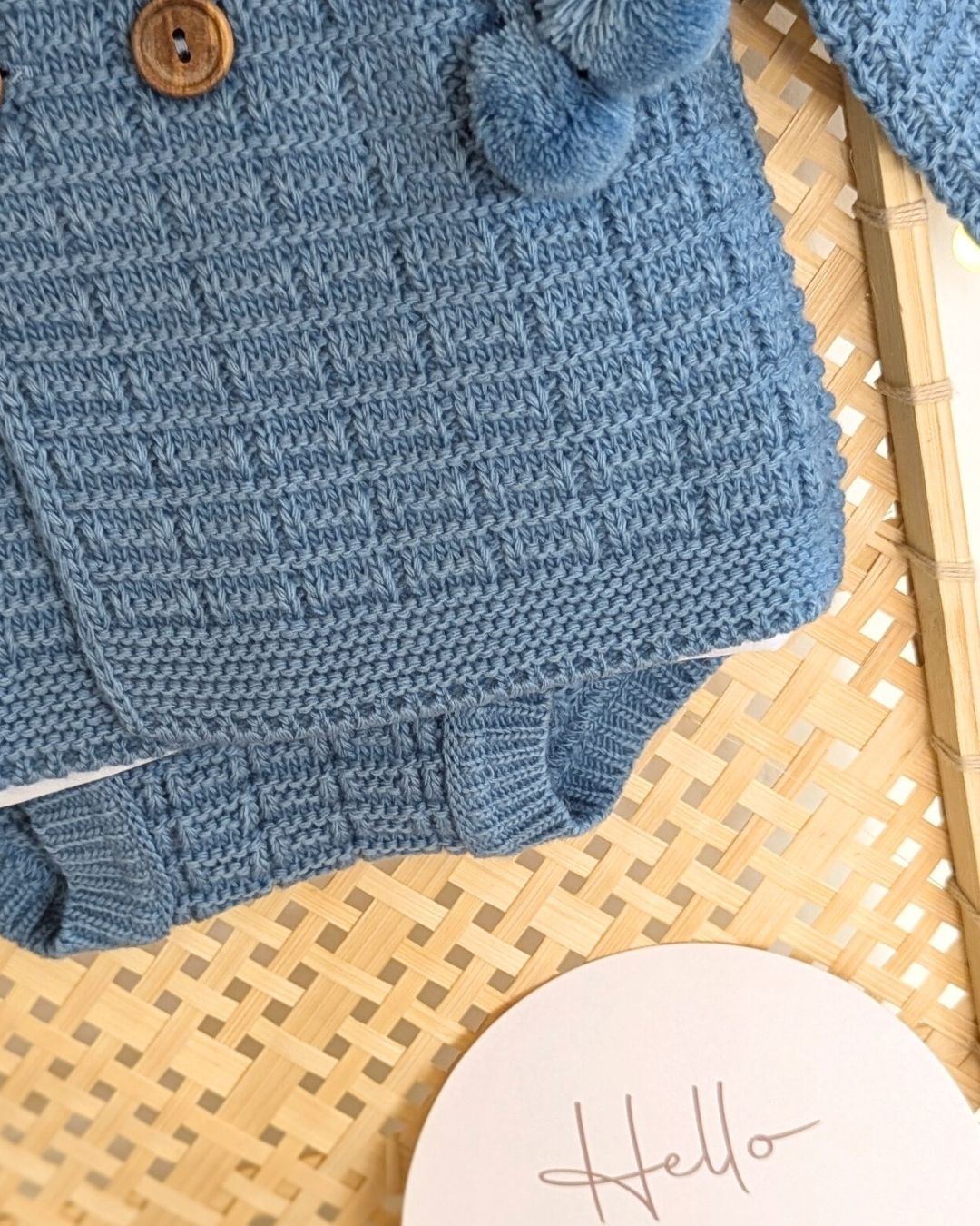 - El conjunto incluye rebeca, blusa, braguita y capota.