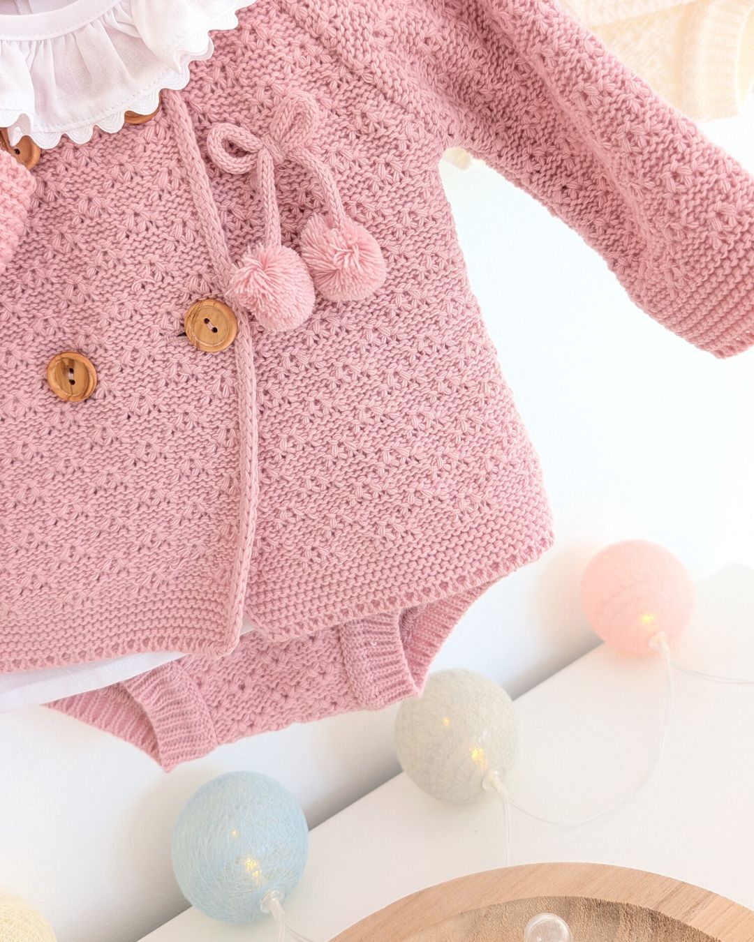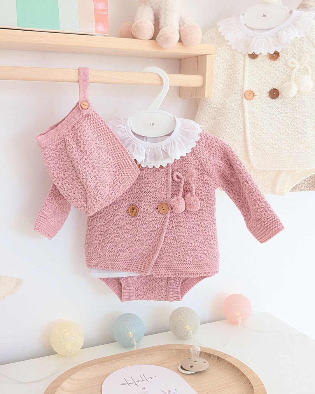 - El conjunto incluye rebeca, blusa, braguita y capota.
