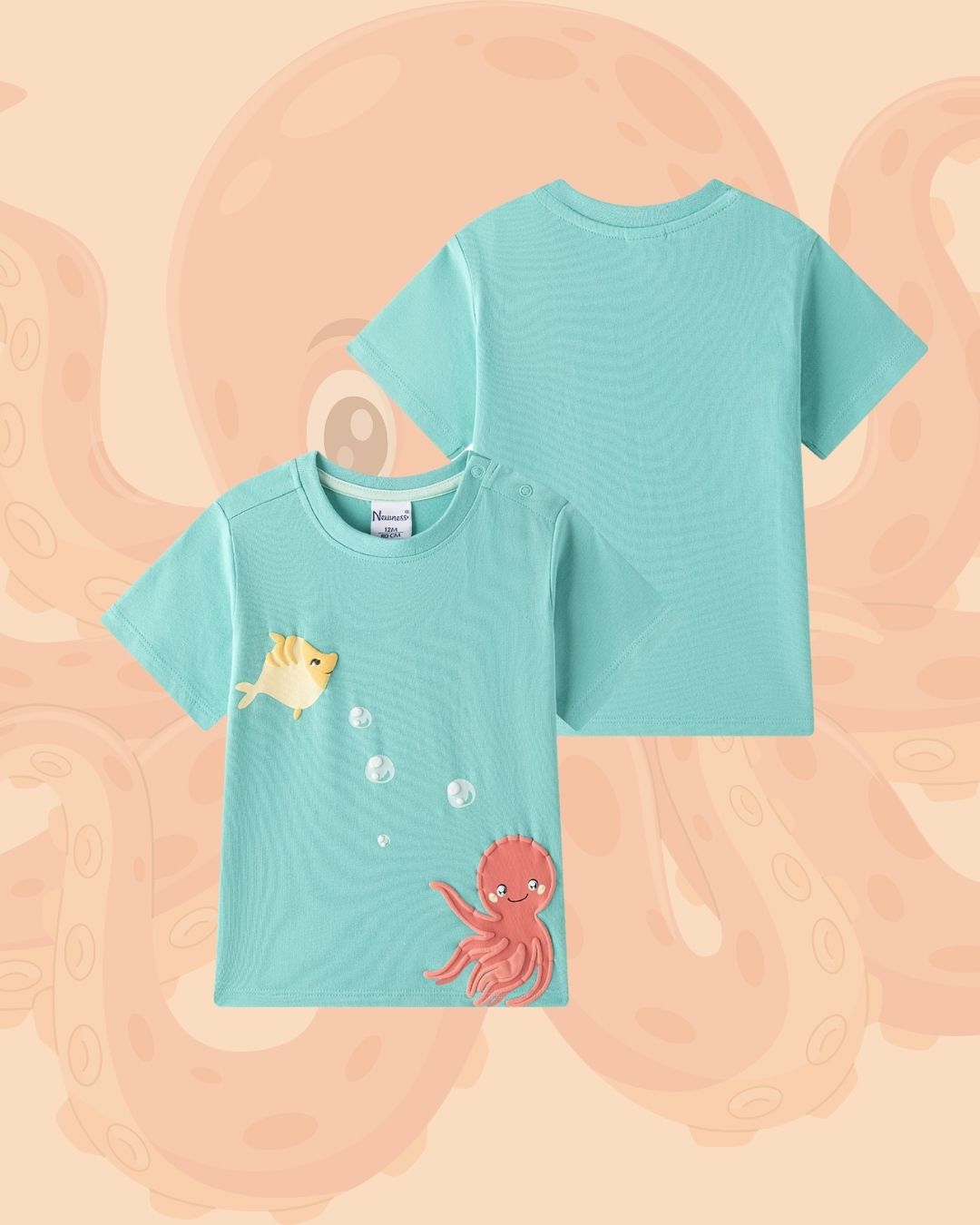 Este alegre conjunto para bebé niño incluye una camiseta turquesa con simpáticos amigos del mar (pez y pulpo) y un short vaquero cómodo y moderno, ideal para jugar, pasear o disfrutar del verano con libertad 🌞👶🏼