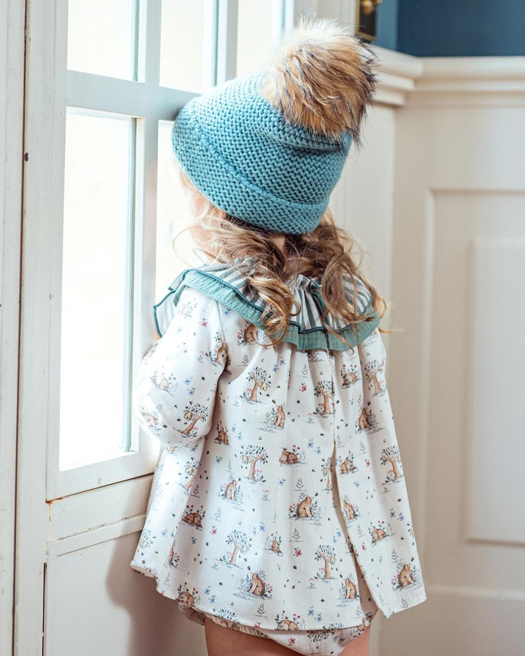 Este jesusín es un verdadero flechazo a primera vista 🥰 Forma parte de la Nueva colección Otoño Invierno 2025 2026 de Yoedu Moda Infantil y está diseñado con un precioso estampado de animalitos del bosque sobre fondo crudo. El cuello fruncido a rayas verde bosque y el gran lazo lateral hacen que esta prenda destaque por su ternura y elegancia.