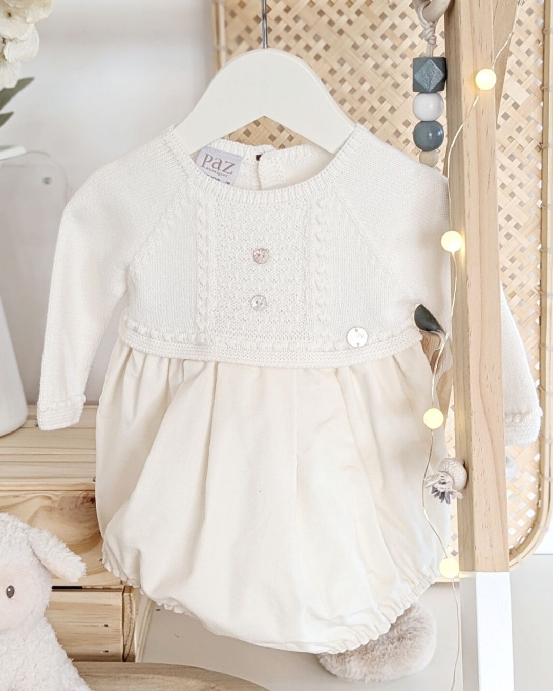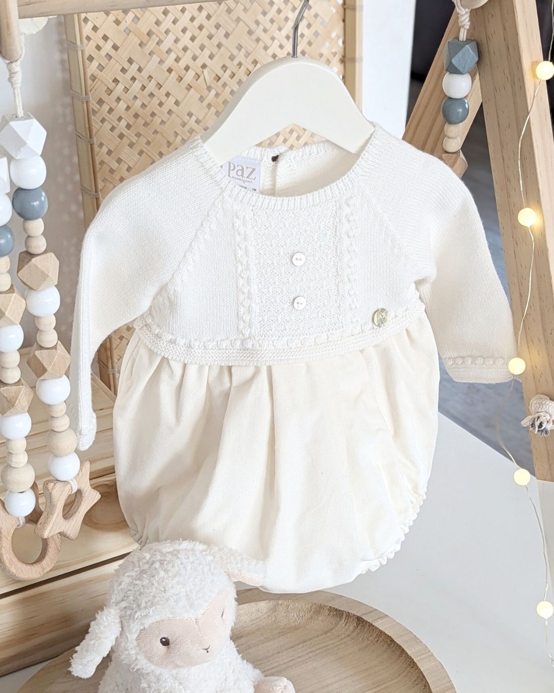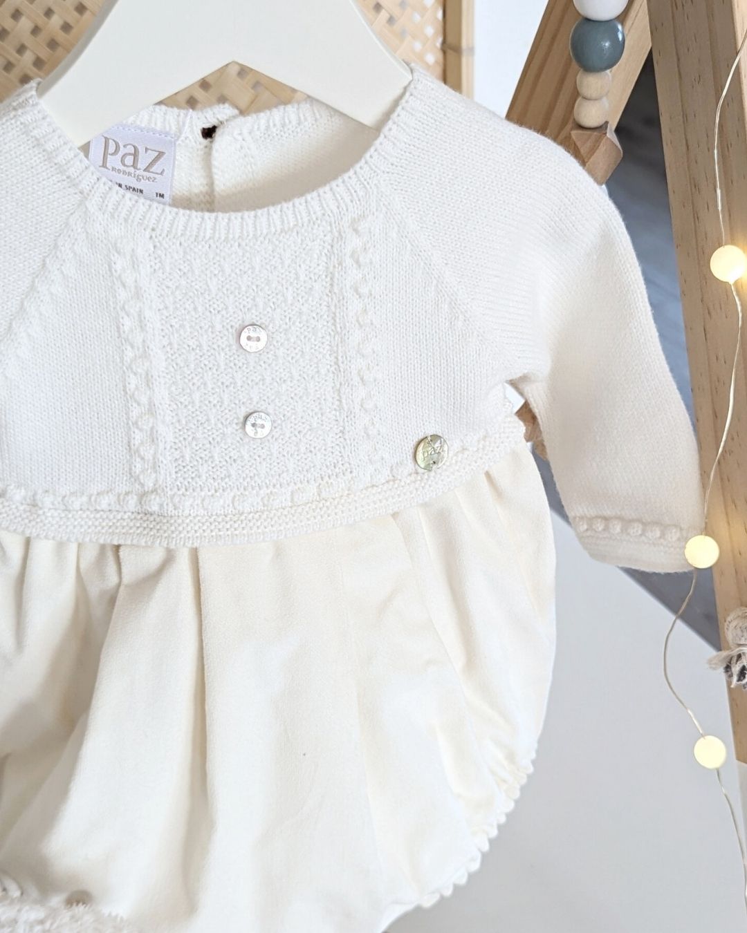 👗 El cuerpo del pelele está tejido en punto fino marfil con detalles calados y cuello decorado con pequeñas detalles. La parte inferior, en un suave terciopelo liso, aporta un extra de elegancia y textura. Un pelele lleno de ternura ideal para lucir en ceremonias, celebraciones o momentos importantes este otoño invierno.