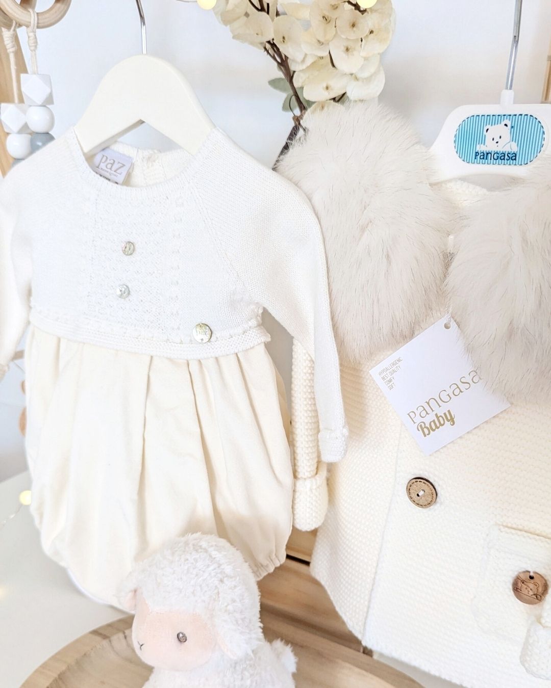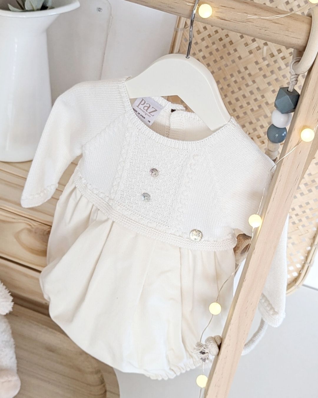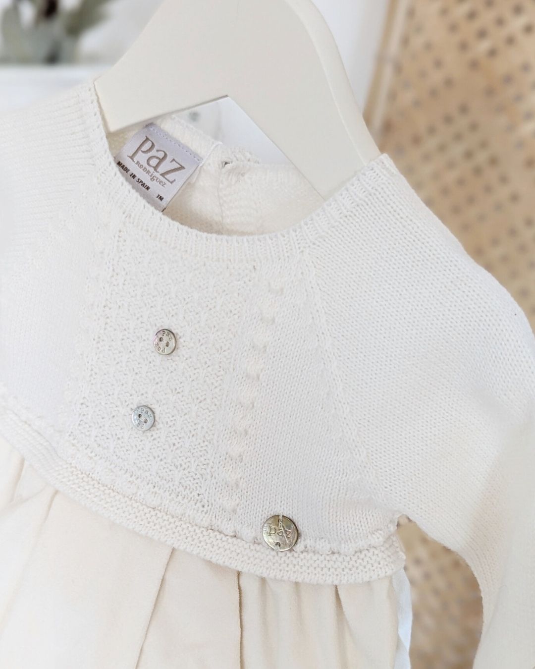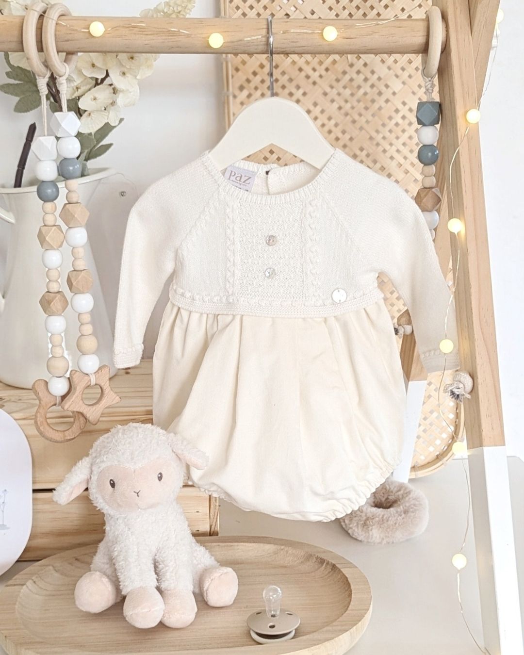 👗 El cuerpo del pelele está tejido en punto fino marfil con detalles calados y cuello decorado con pequeñas detalles. La parte inferior, en un suave terciopelo liso, aporta un extra de elegancia y textura. Un pelele lleno de ternura ideal para lucir en ceremonias, celebraciones o momentos importantes este otoño invierno.