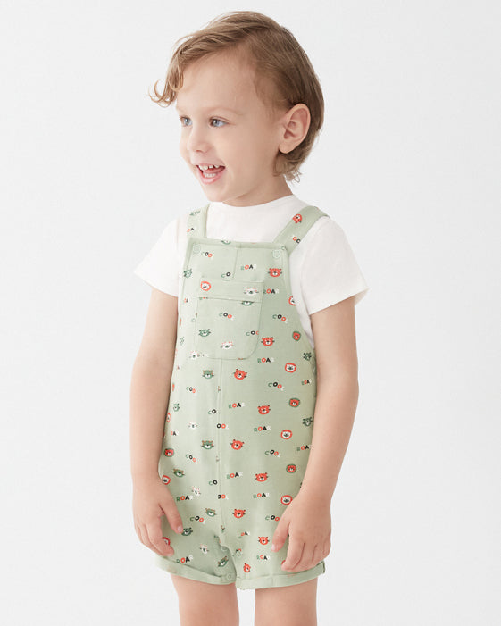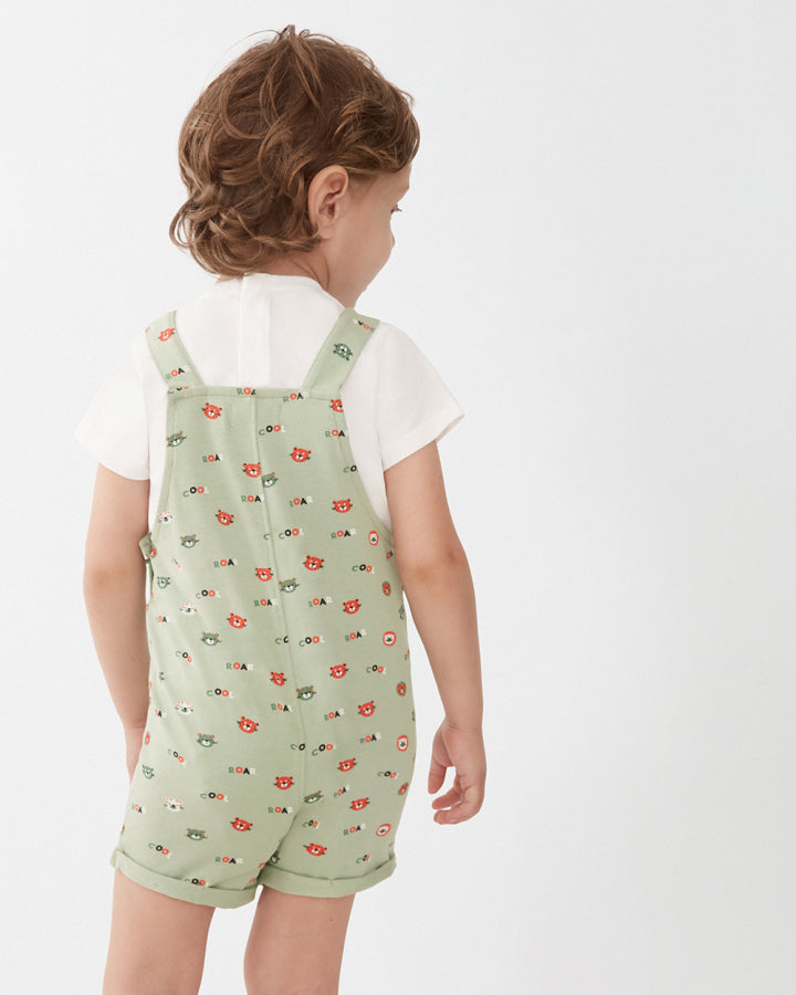 Cierre con botones a presión en el hombro para mayor practicidad en el cambio. Peto en color verde oliva con divertido estampado de caritas de leones y palabras como "Roar" y "Cool", aportando un toque original y juguetón. Diseño con tirantes ajustables y bolsillo frontal decorativo. Cierre con botones a presión en la entrepierna para mayor comodidad.