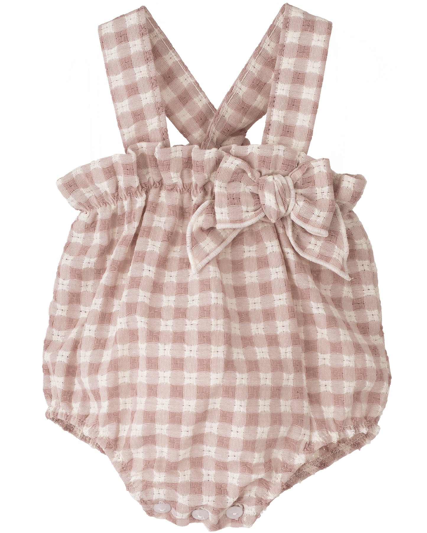 Este adorable peto con lazo para bebé niña es ideal para los días cálidos de primavera y verano. Confeccionado en un algodón 100% fino y transpirable, destaca por su tejido cuadro vichy rosa nude y blanco y por sus tirantes cruzados en la espalda que rematan con un gran lazo, aportando un toque dulce y elegante.