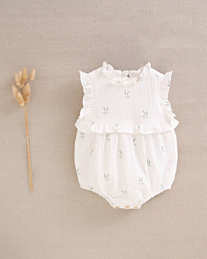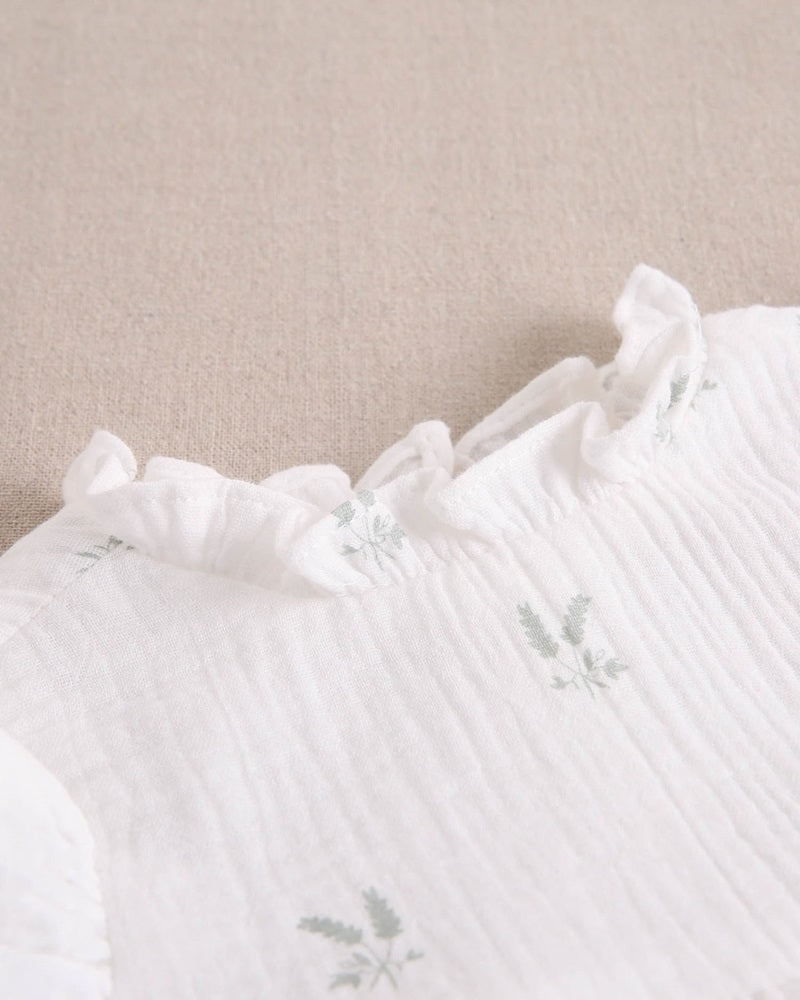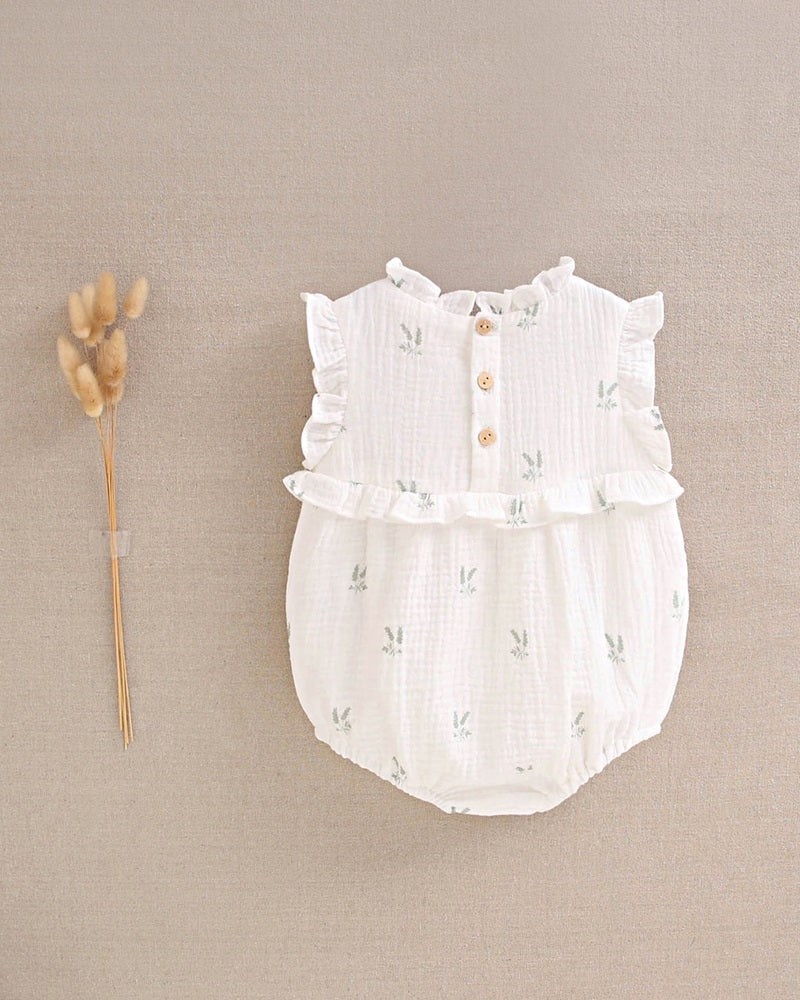 Dale un toque natural y delicado al look de tu bebé con esta preciosa ranita blanca con estampado de ramitas verdes, parte de la encantadora colección Eucalipto de Dadati. Confeccionada en algodón suave tipo muselina, con volantes en hombros y cintura, es ideal para los días de sol, las fotos más tiernas y las ocasiones especiales ☀️📸