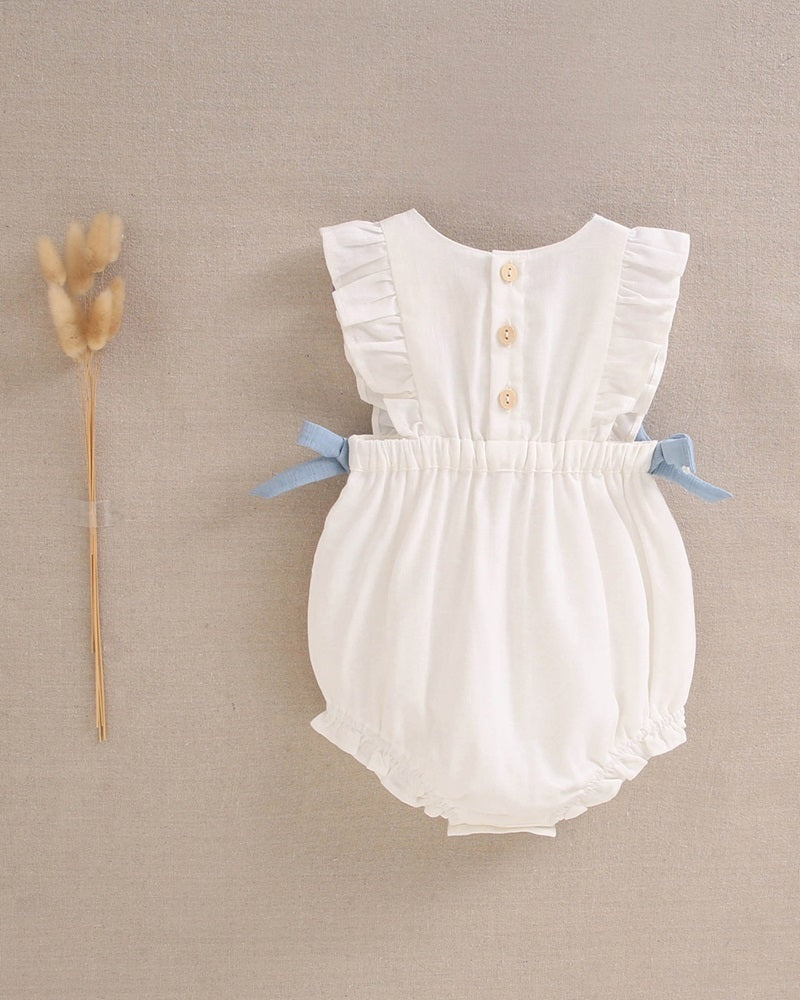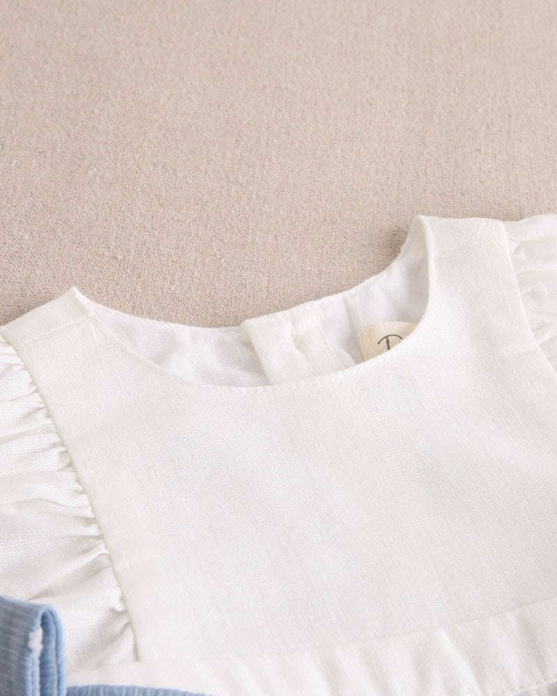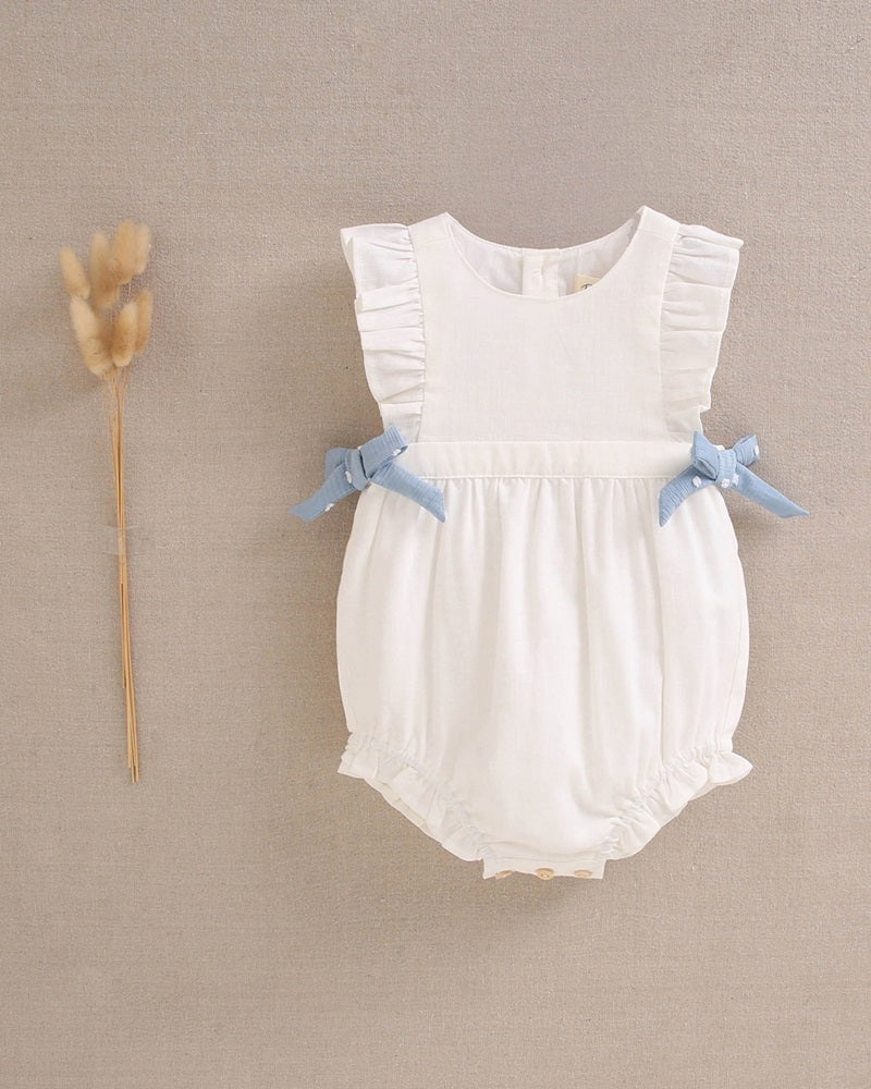 Esta preciosa ranita de bebé blanca con volantes y lazos laterales azules es perfecta para los días de sol ☀️. Confeccionada en tejido suave y fresco, es ideal para la piel delicada de tu peque. El diseño clásico con detalles románticos la convierte en una prenda imprescindible en su armario. ¡Ideal para ocasiones especiales o para lucir a diario! 💖