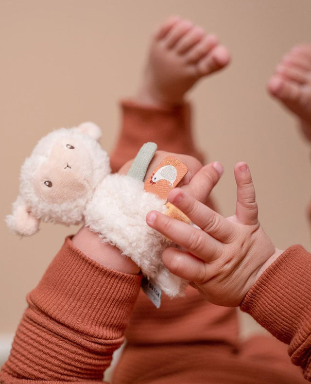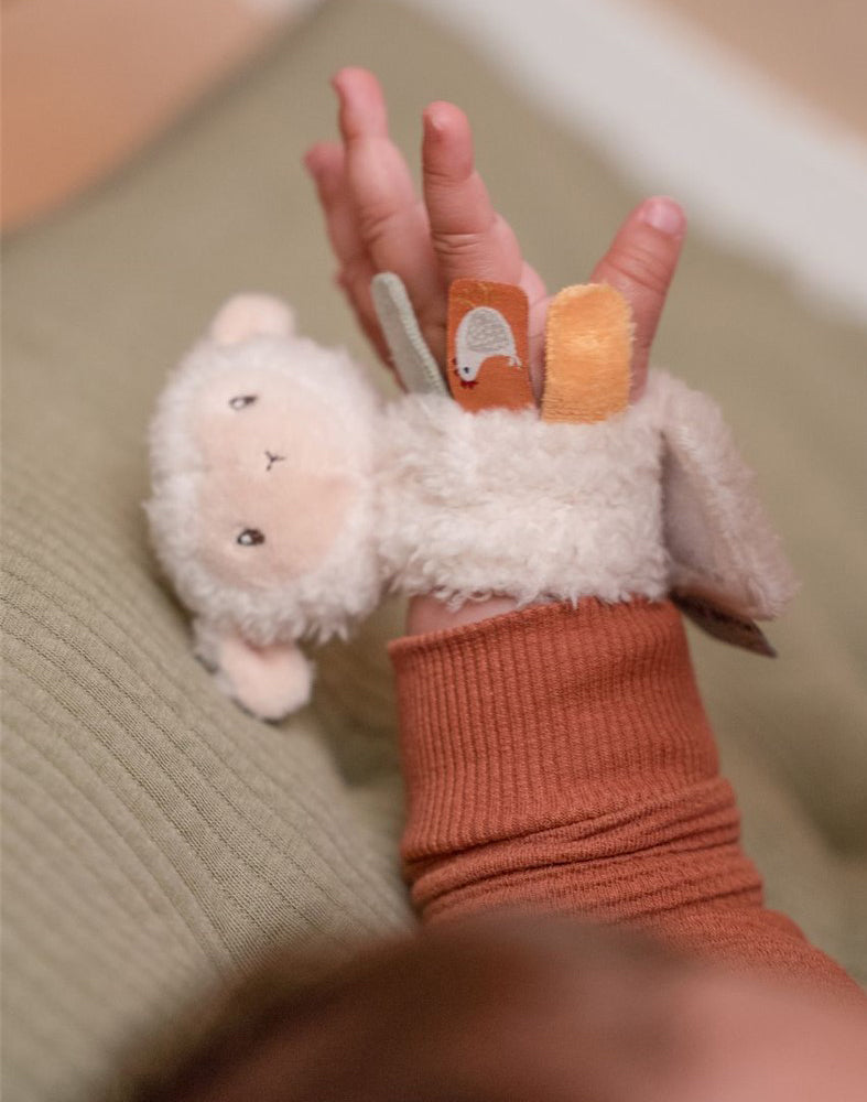 ¡Agita tus manos y alucina! Este suave sonajero de pulsera alegrará a tu bebé. Átalo alrededor de la muñeca de tu bebé, hazlo sonar y empieza la diversión. La suave ovejita de la pulsera está listo para moverse, pero hay mucho más que explorar, partes crujientes, etiquetas y pequeños nudos animan a agarrar y tocar. Un juguete maravilloso para un bebé feliz.
