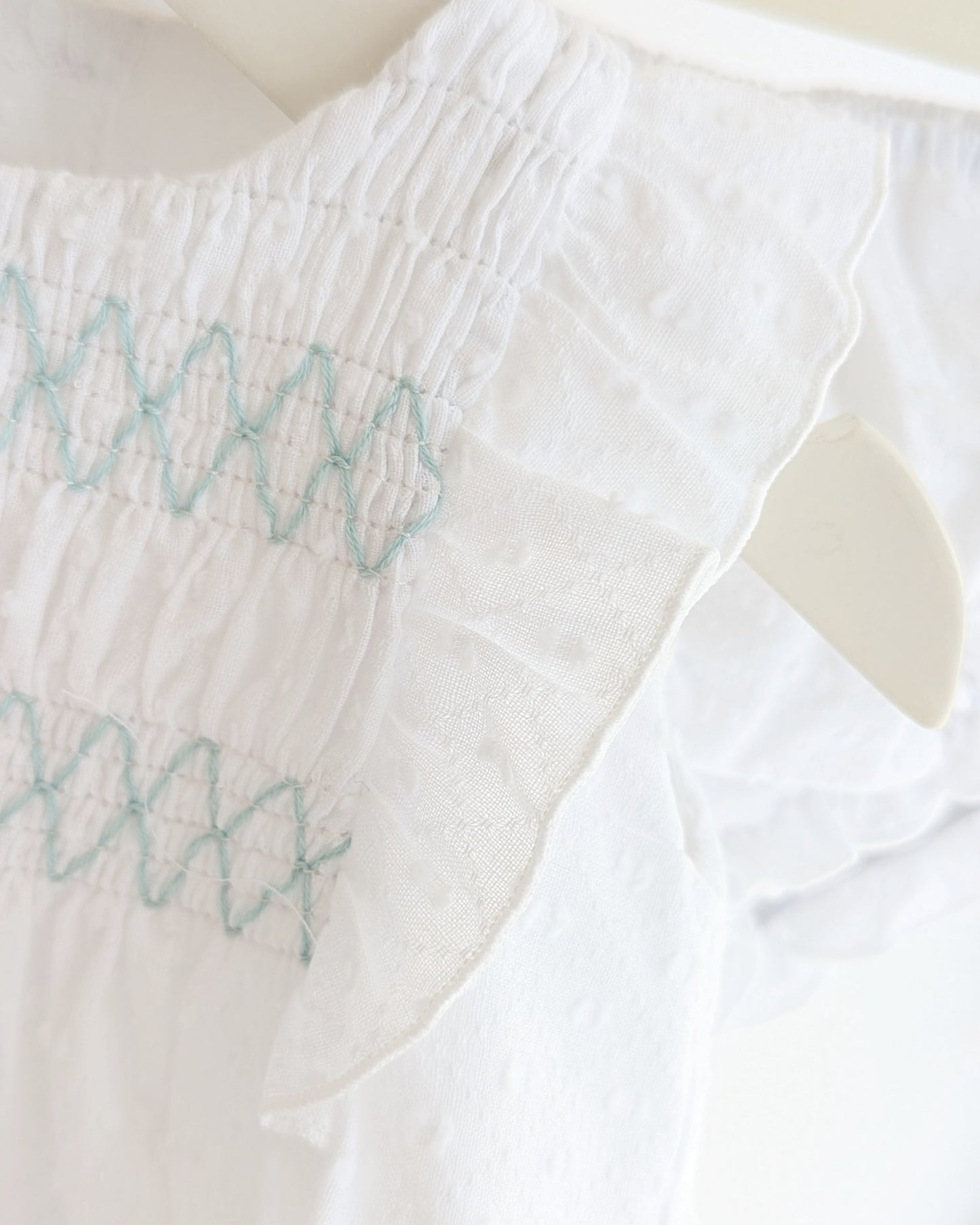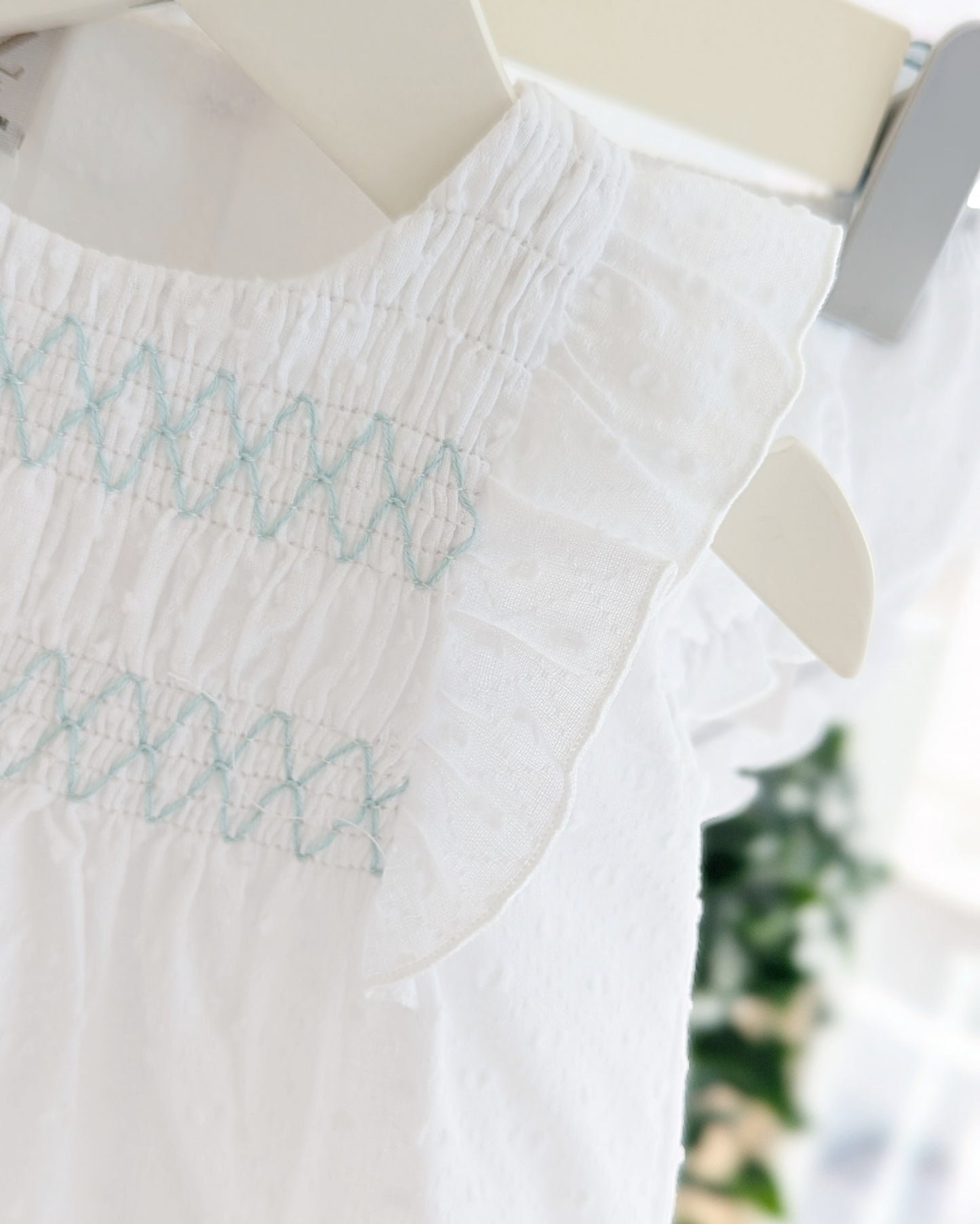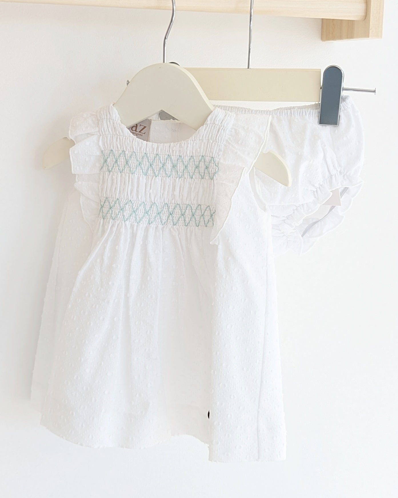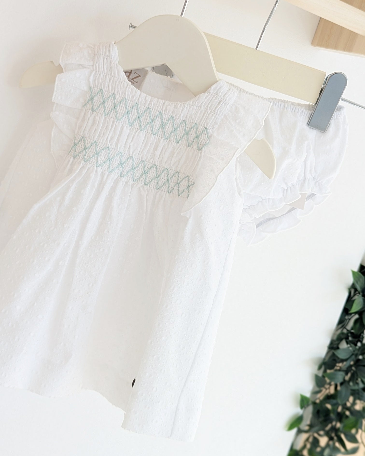 Haz brillar a tu peque con este encantador vestido blanco de plumeti para bebé, ideal para primavera y verano. Con un delicado bordado en el pecho en verde agua, volantes en las mangas y cierre con botones en la espalda, este conjunto incluye braguita a juego para completar el look. Su diseño fresco y elegante es perfecto para paseos, eventos especiales o días de calor.