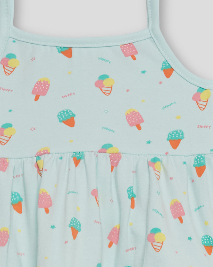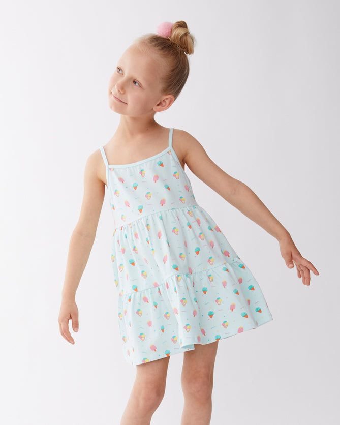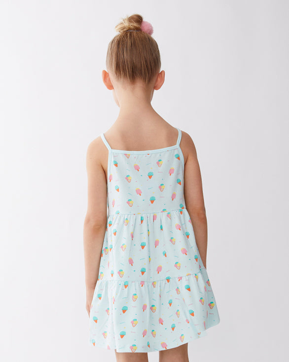 Un diseño ligero y encantador en color azul nube con un dulce estampado de helados en tonos pastel. Con tirantes finos y una silueta de corte evasé, incorpora una falda de tres volantes con vuelo, aportando un movimiento fresco y fluido.