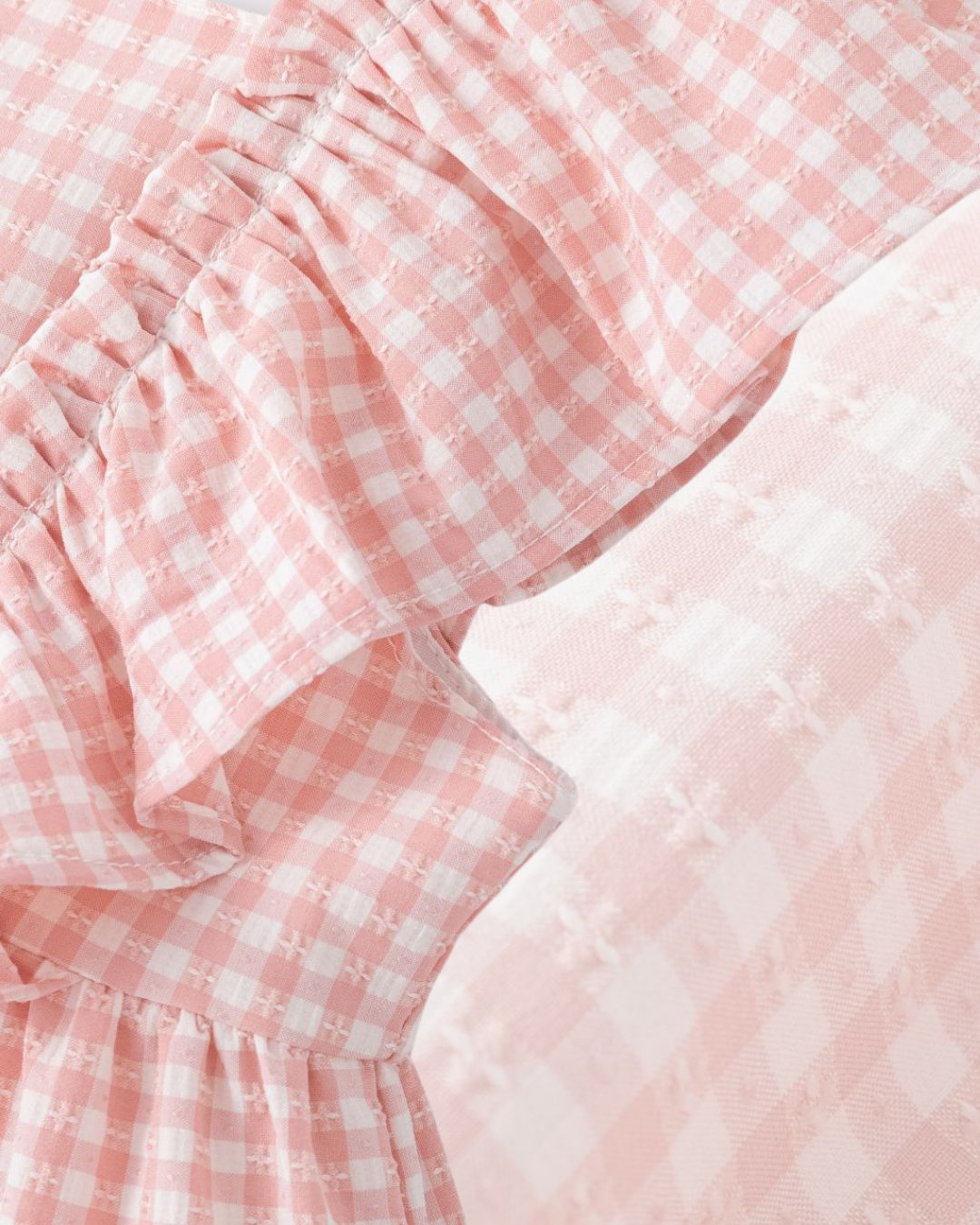 Este precioso vestido de niña en cuadro vichy rosa es una prenda ideal para la temporada primavera-verano. Su diseño con volantes en los tirantes y corte cómodo hacen de él una opción encantadora y fresca para niñas de 3 a 9 años 🌞✨