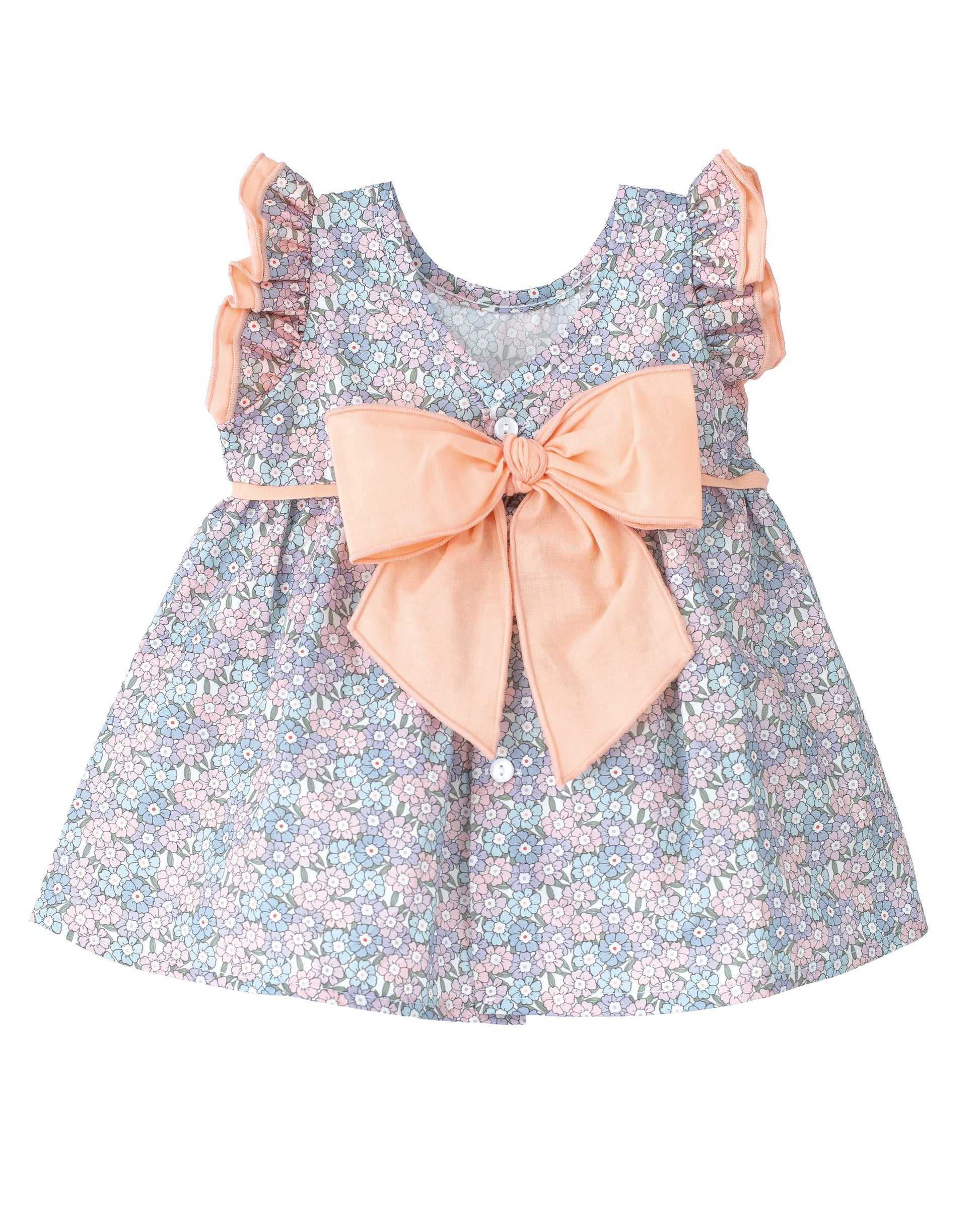 👶 Vestido estampado de azules y rosas con un gran lazo en la espalda en color melocotón para niña de la Colección Mármara de Calamaro Baby.